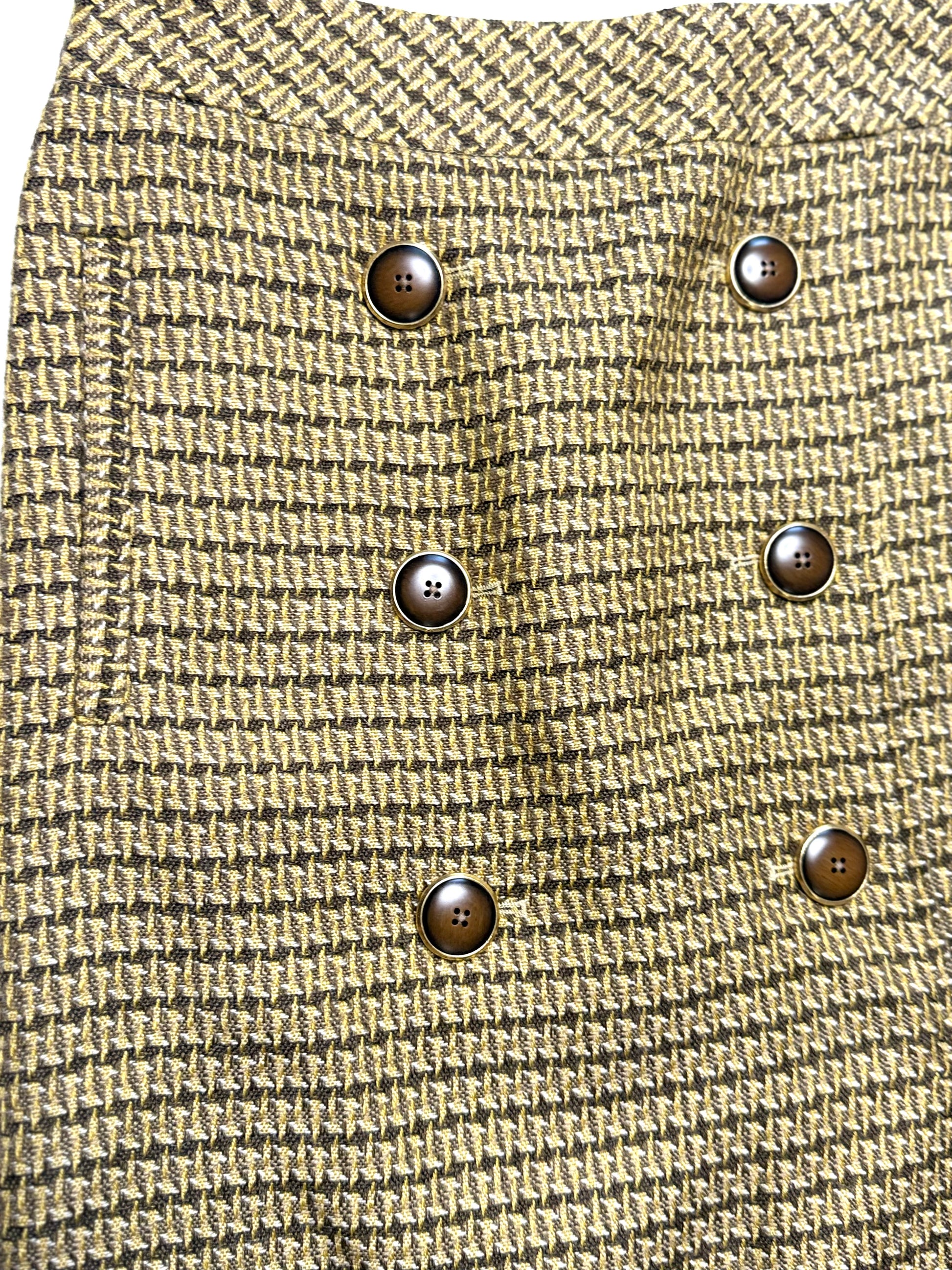 Channel classic preppy style with this Ann Taylor brown and yellow plaid skirt in size 2. Designed with decorative front button accents, a chic front split, and functional side zipper, this skirt blends form and function. The fully lined wool-blend fabric (90% acrylic, 10% wool) offers warmth and structure, making it perfect for fall or winter layering.