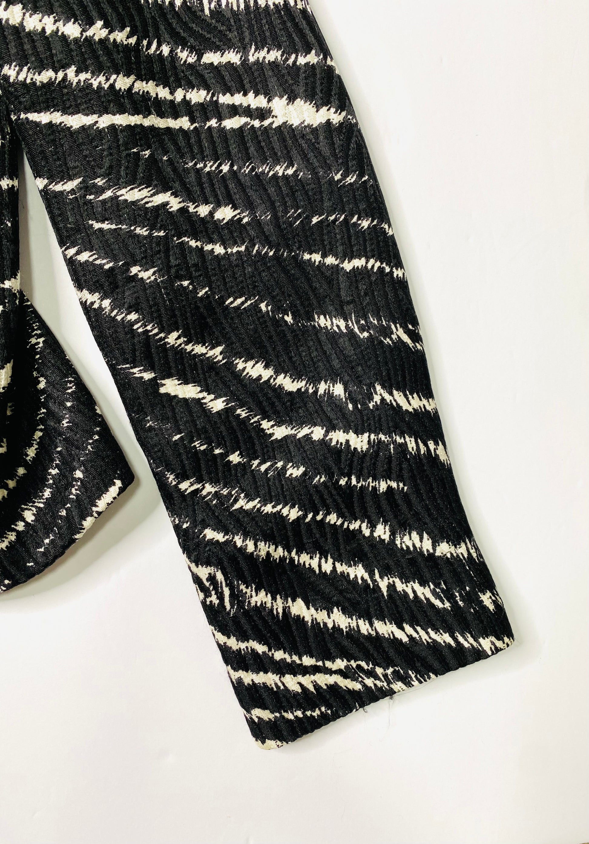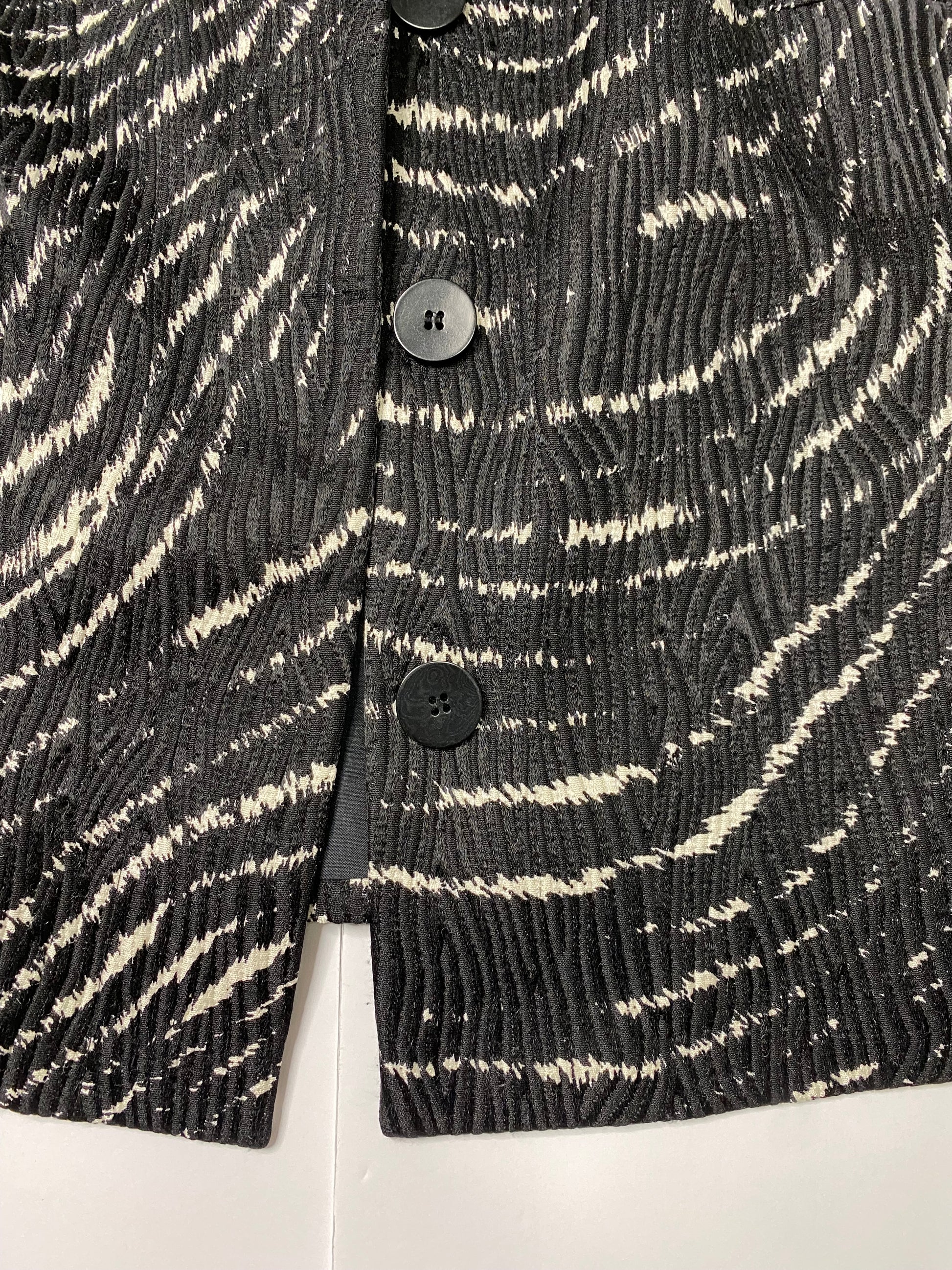 Featuring a striking black and ivory zebra print, it offers a statement look with a sleek, button-front closure, notched lapels, and a tailored silhouette that flatters the figure. The high-quality fabric composition—52% silk, 42% wool, and 6% viscose—provides a soft hand feel with a polished finish, perfect for year-round wear.