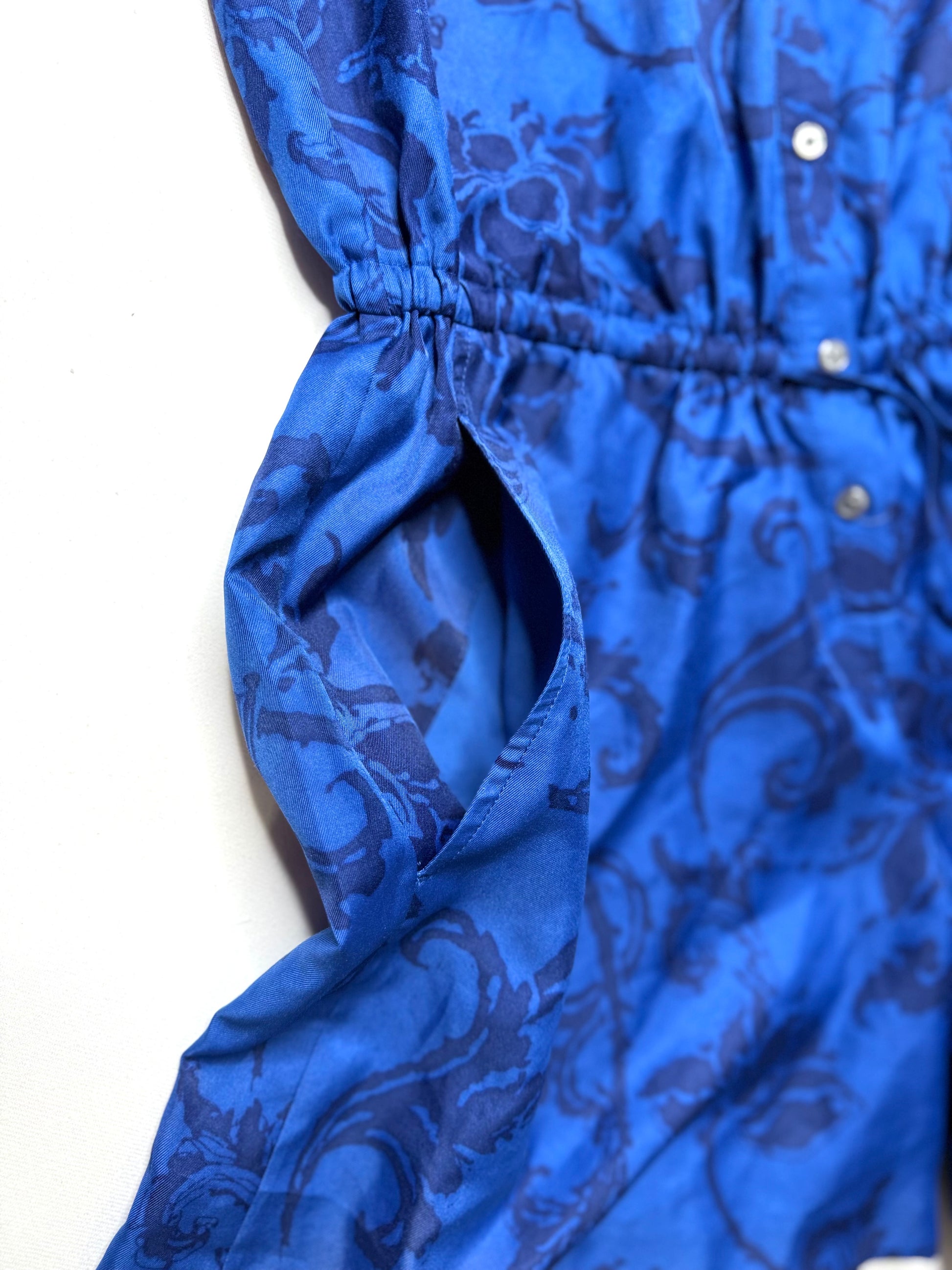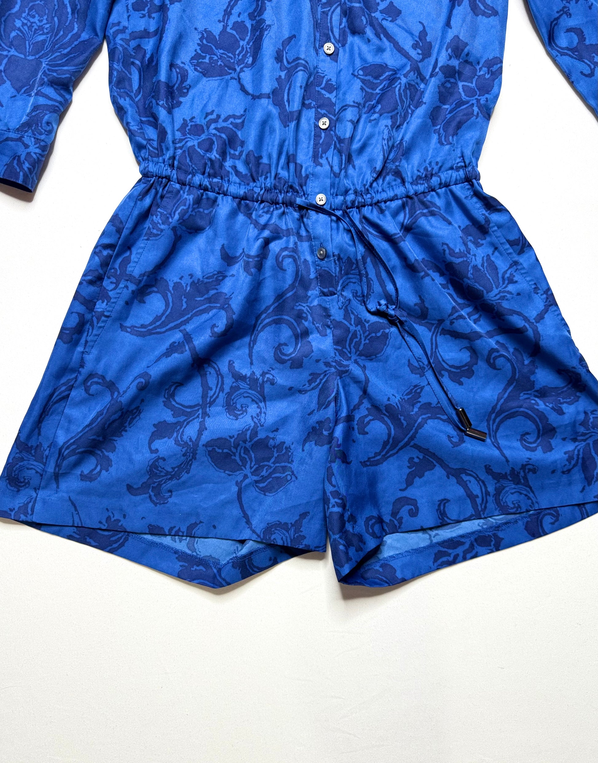 Step into effortless style with this Banana Republic blue-on-blue floral print romper, perfect for warm-weather days or casual outings. Designed with a button-down front, 3/4-length sleeves, and an adjustable elastic waist tie, this romper blends comfort with polished style. Functional side pockets add convenience, making it a versatile wardrobe staple.