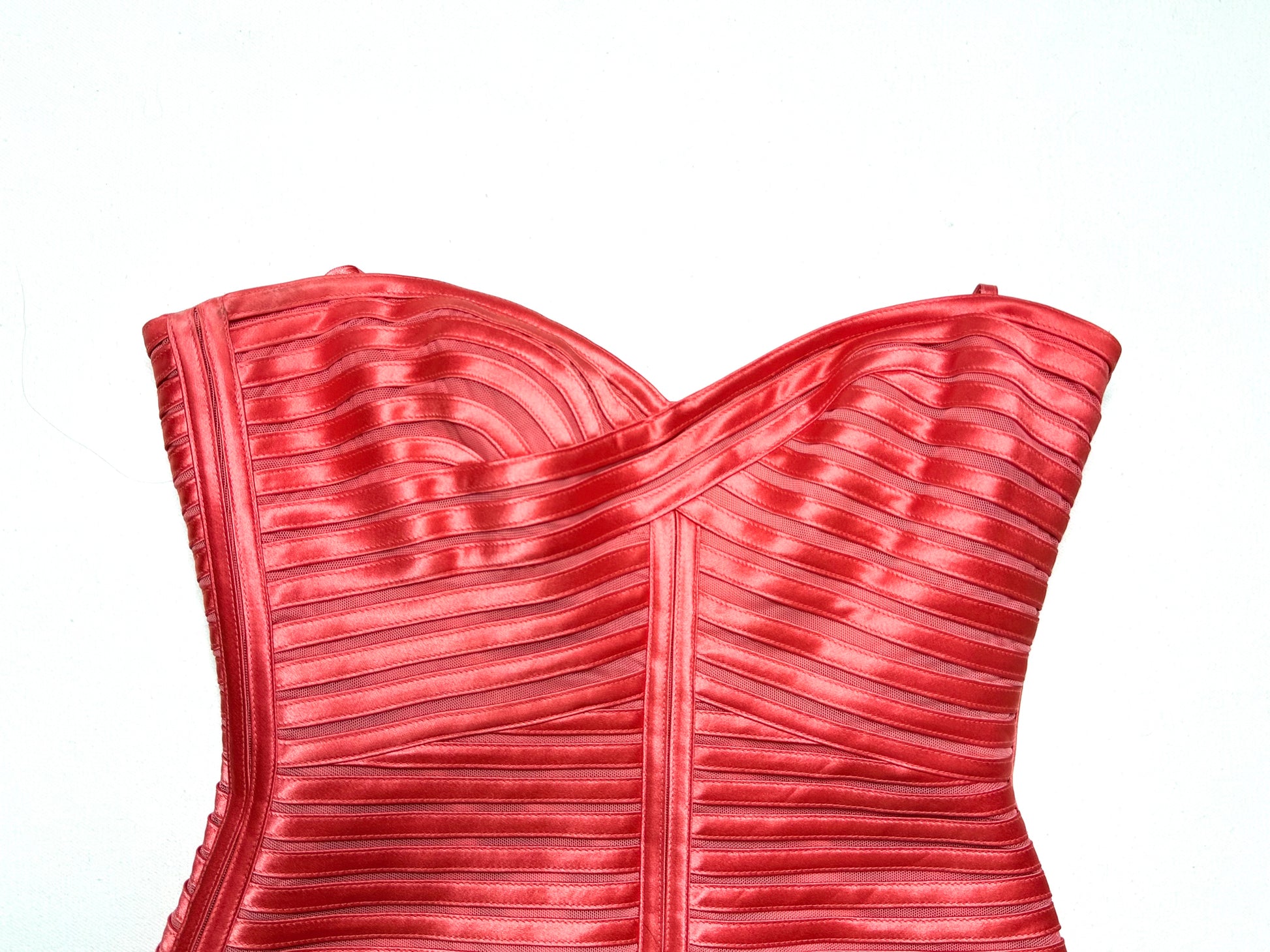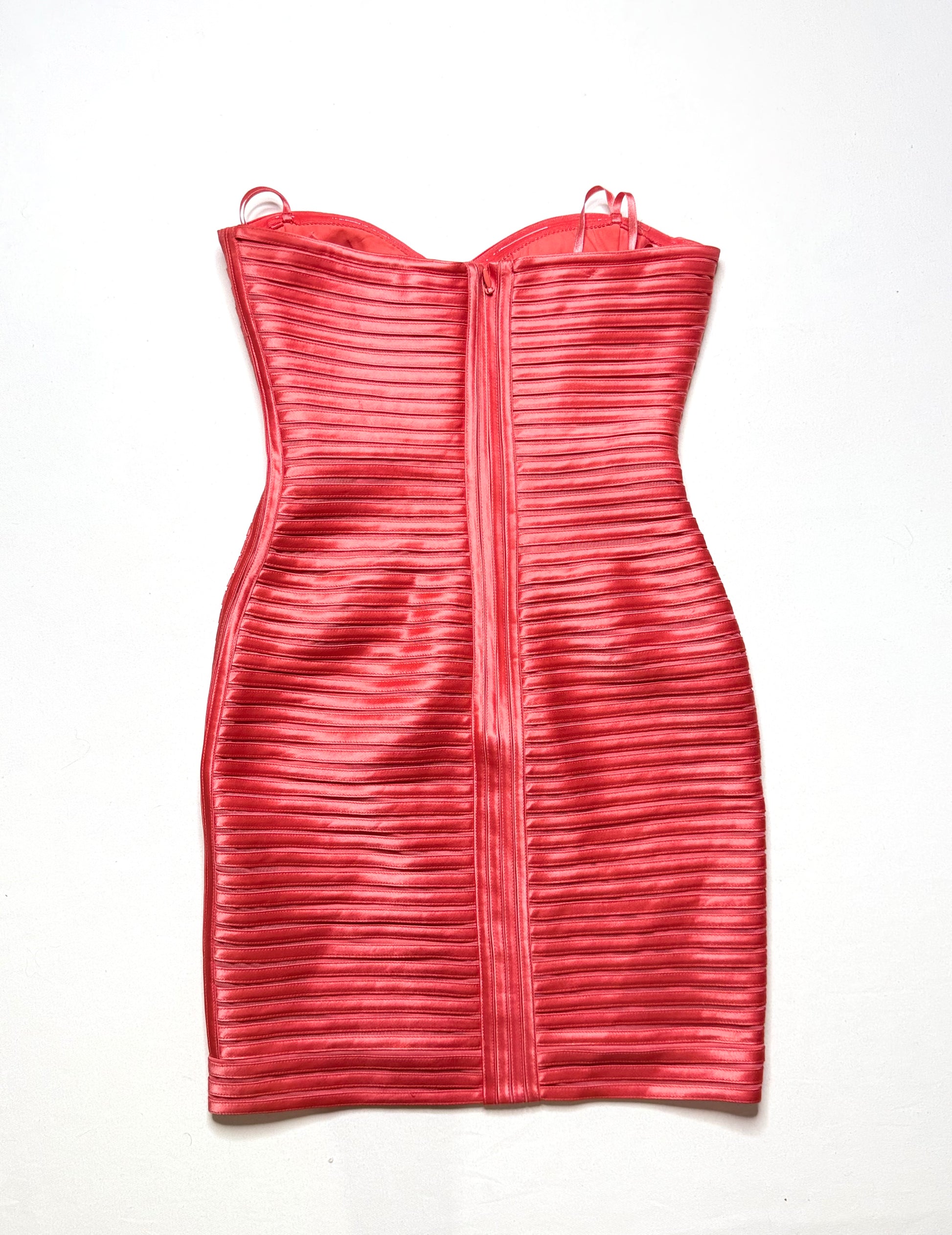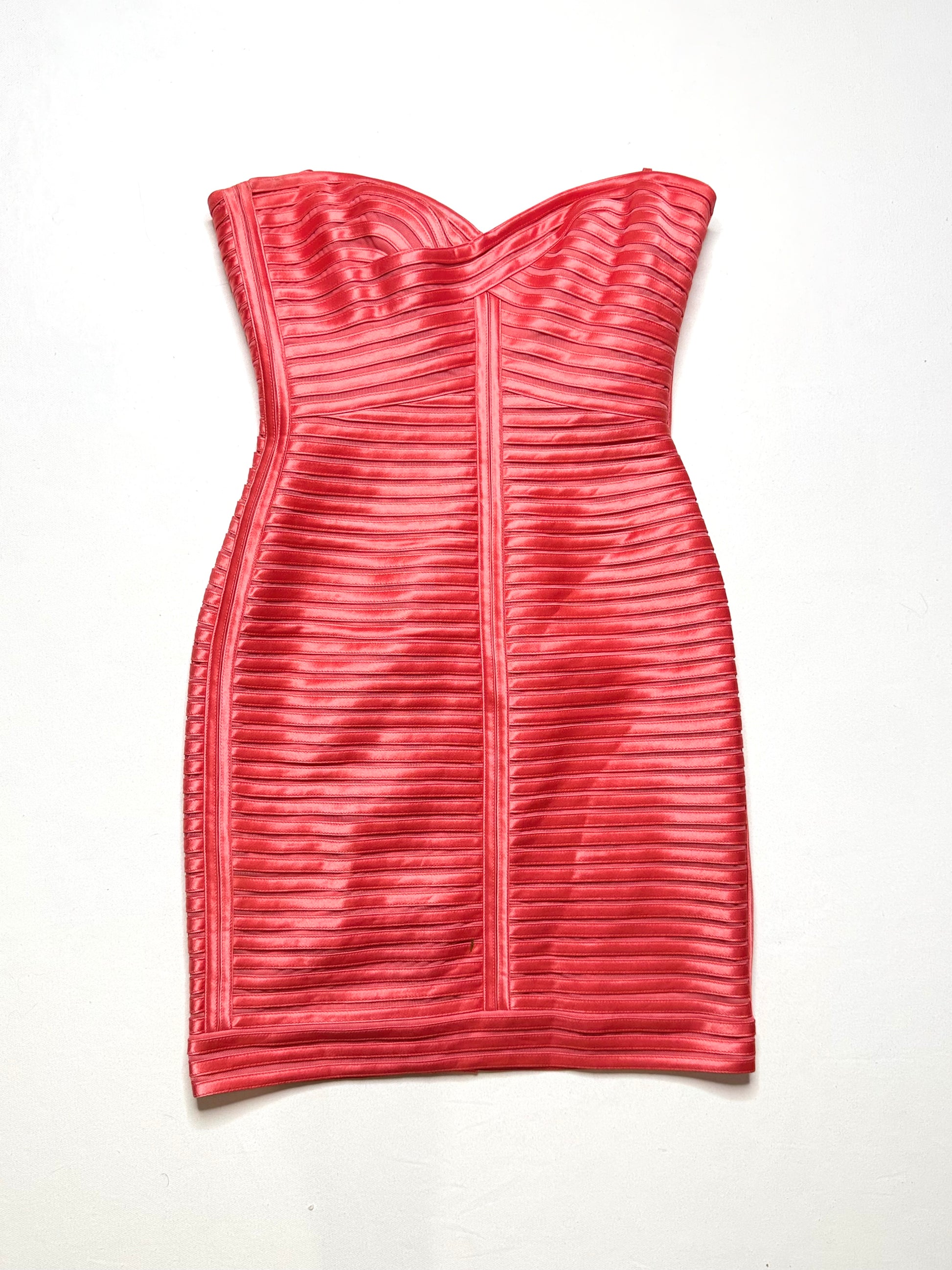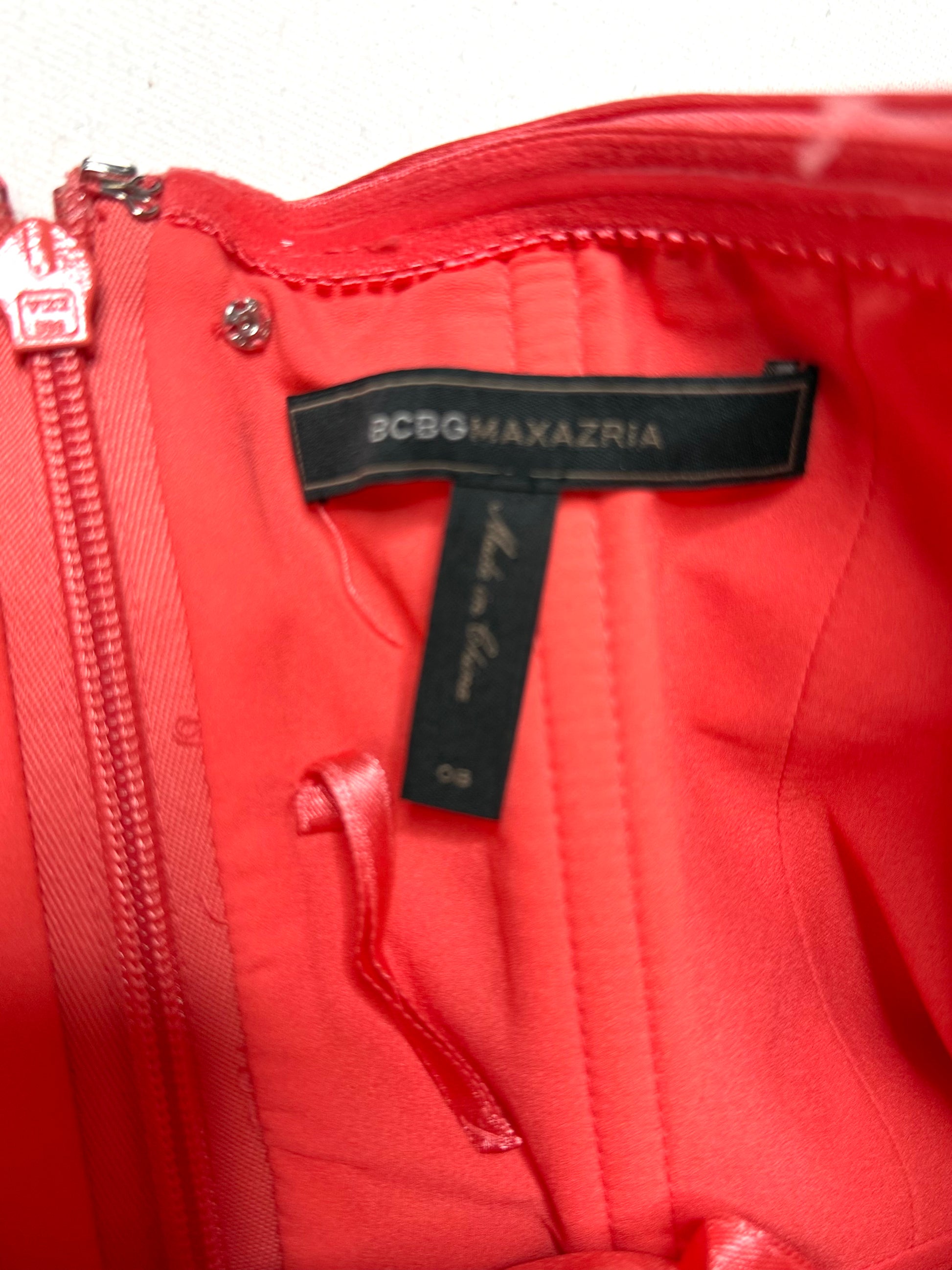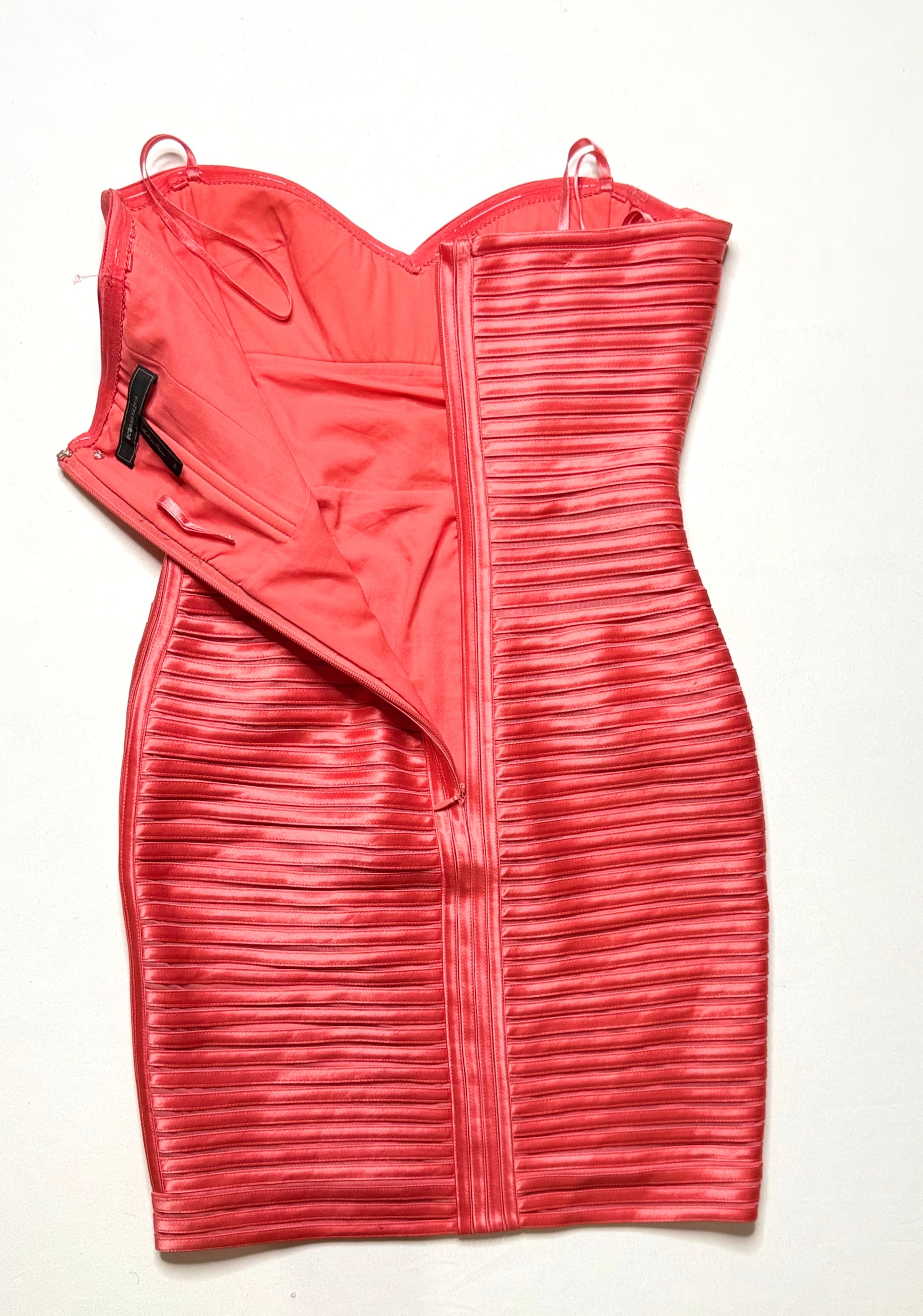 BCBG Max Azria Coral Satin Ribbed Bodycon Dress – Size 8, Sweetheart Neckline, Excellent Condition