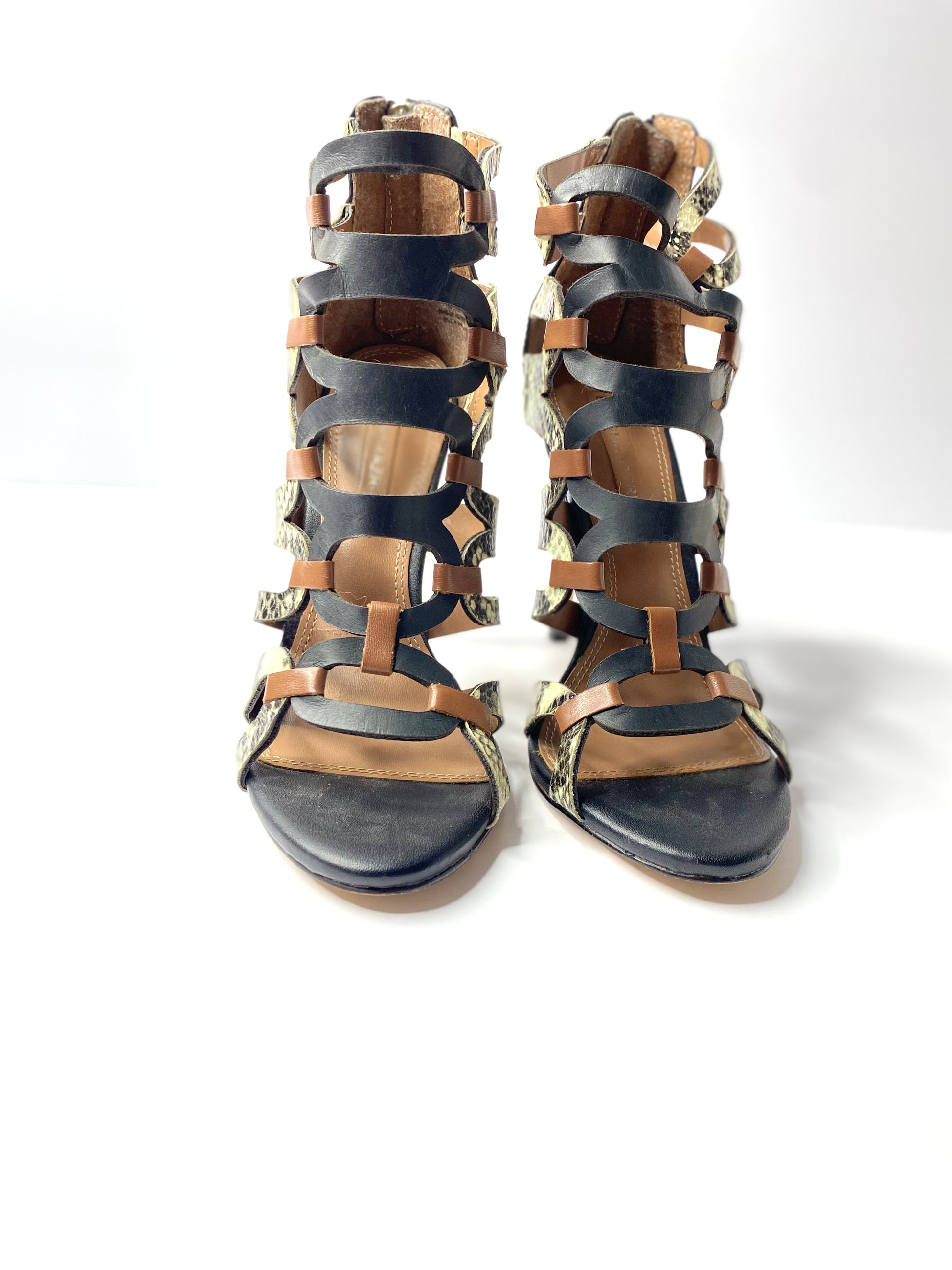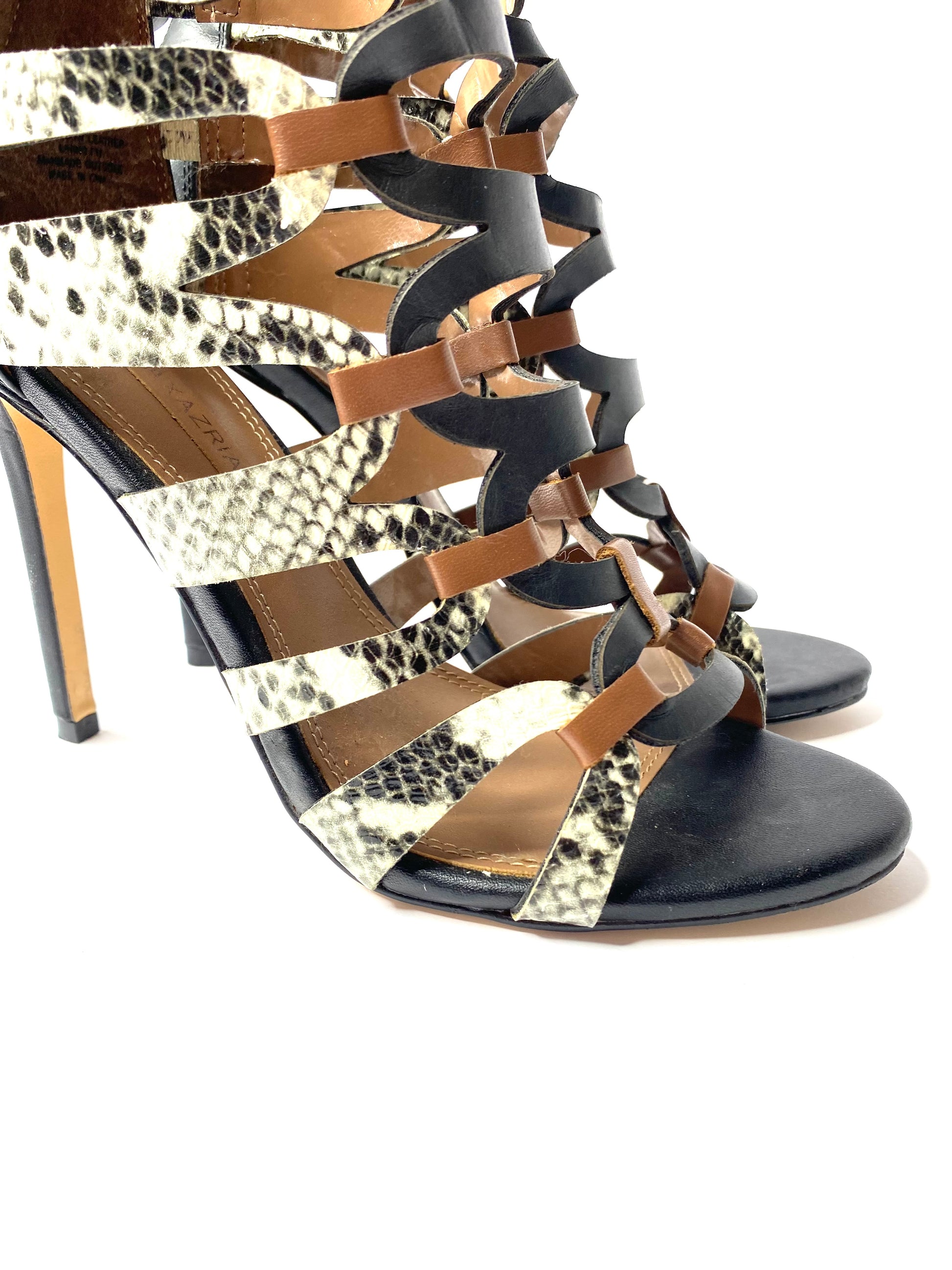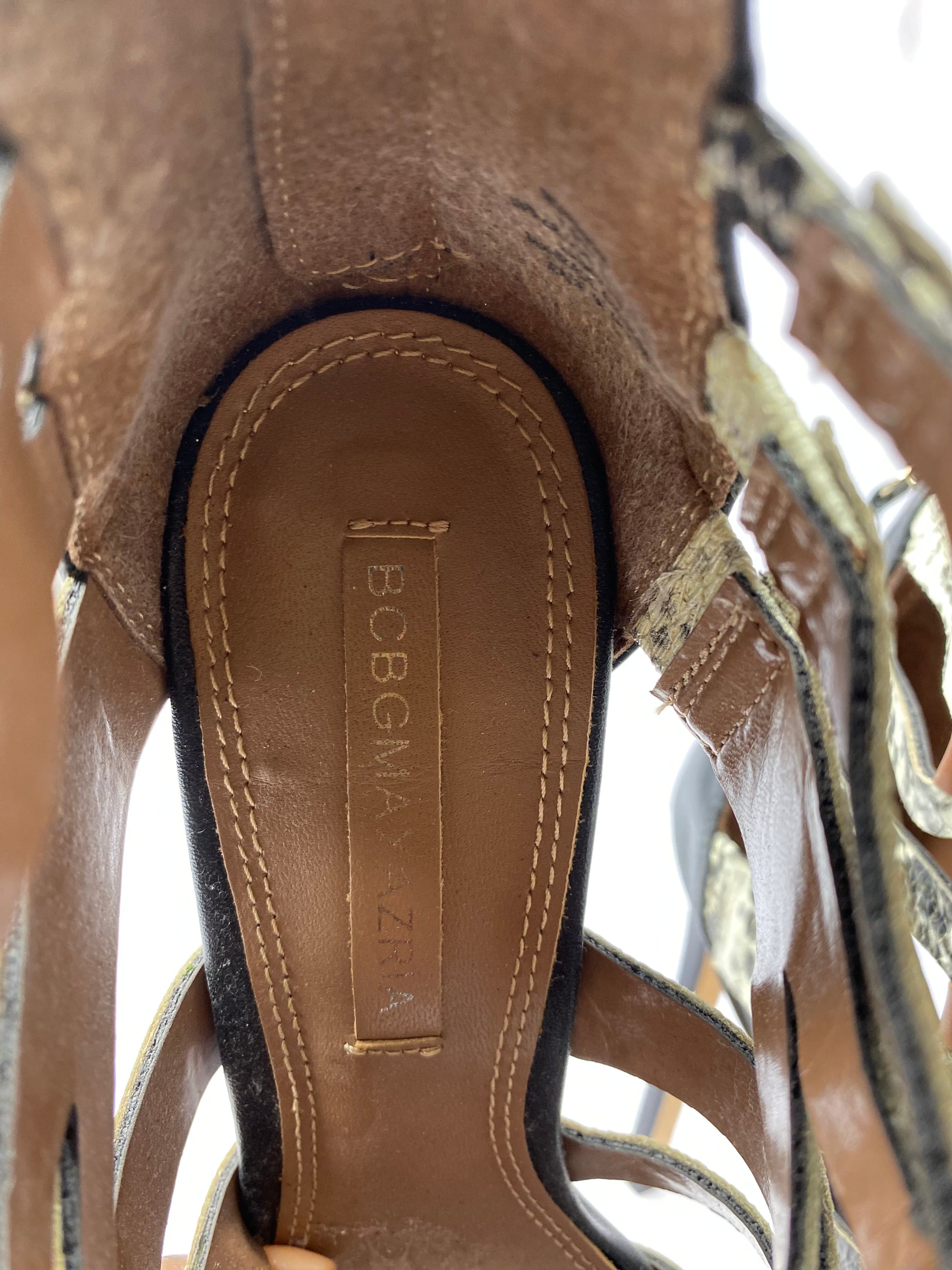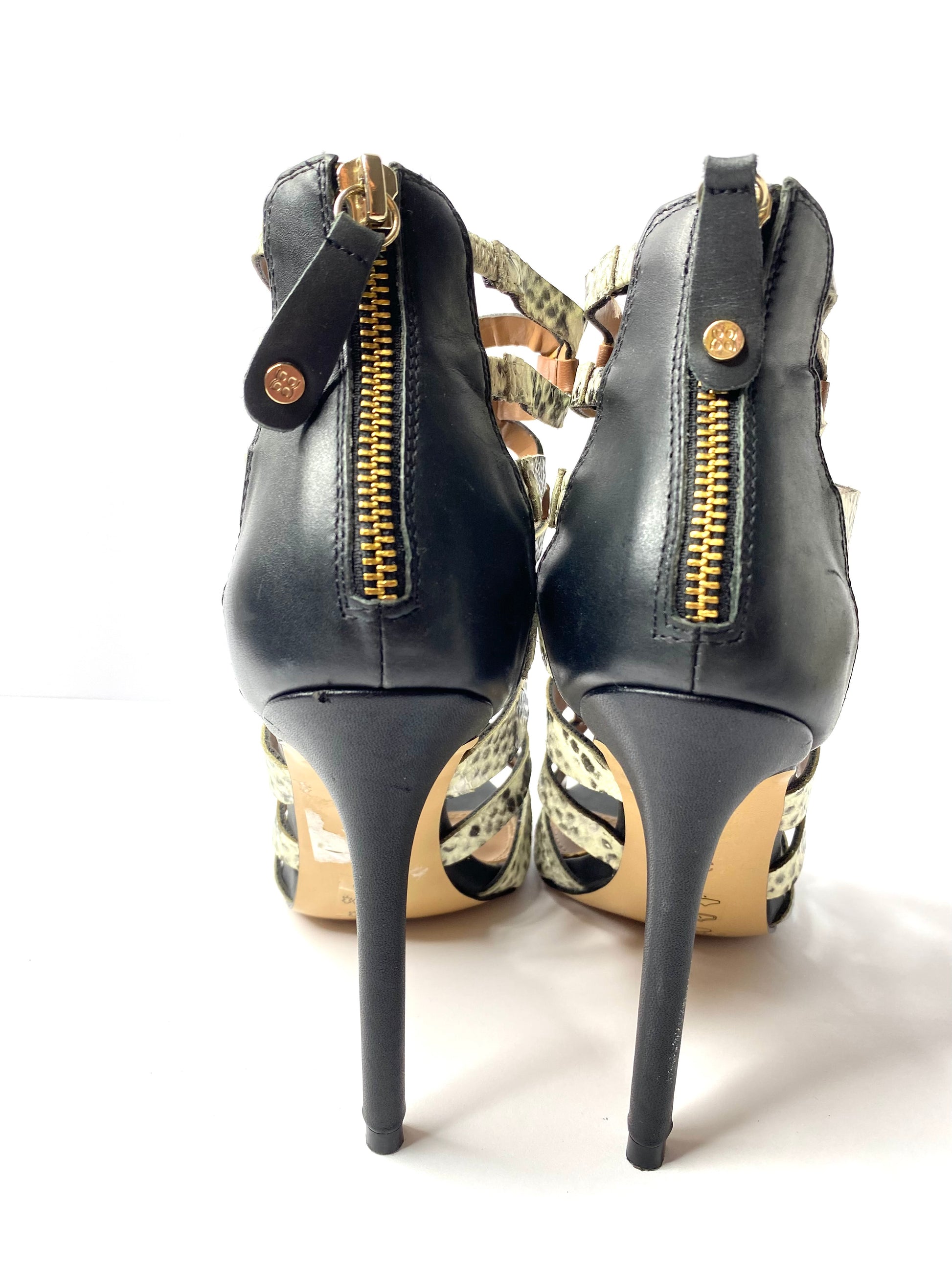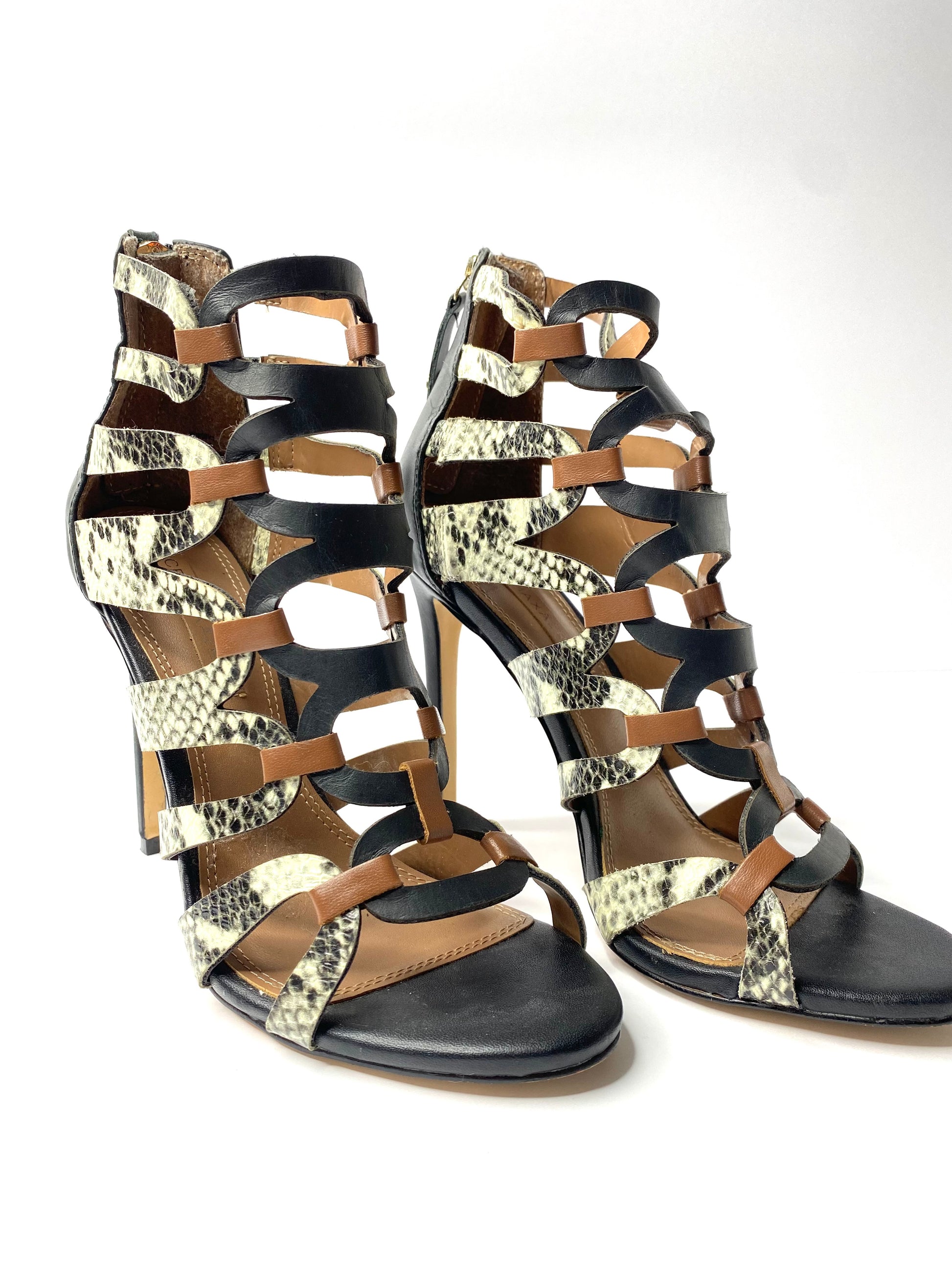 BCBG Snake Print Cage Leather Heels – Size 7.5 – 4” Cut-Out Stiletto Sandals