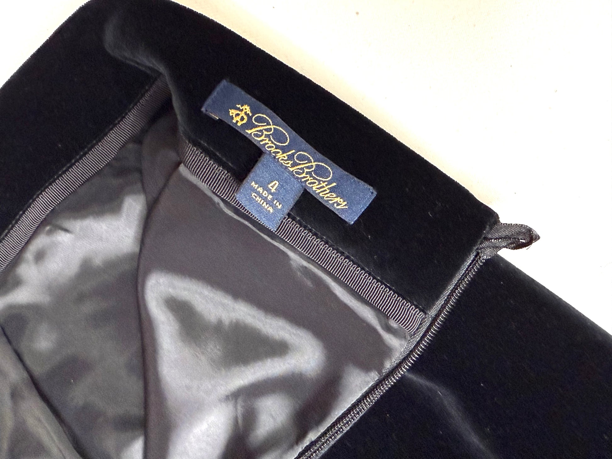 Crafted from a luxurious velvet-like fabric, it includes a zipper closure and full lining for comfort and structure. Its refined design embodies the sophisticated tailoring Brooks Brothers is known for, while the embellished slit adds a modern, festive twist.