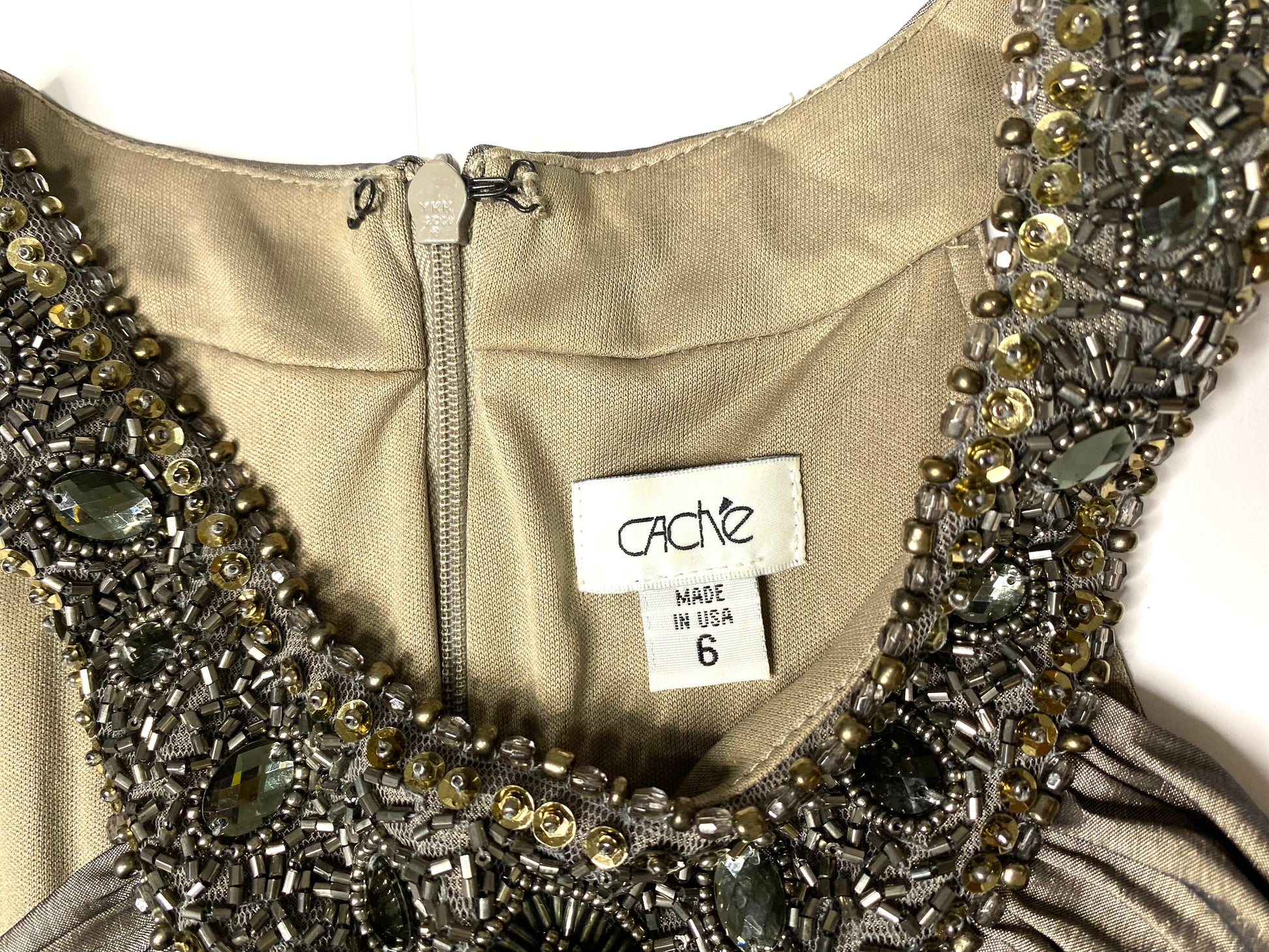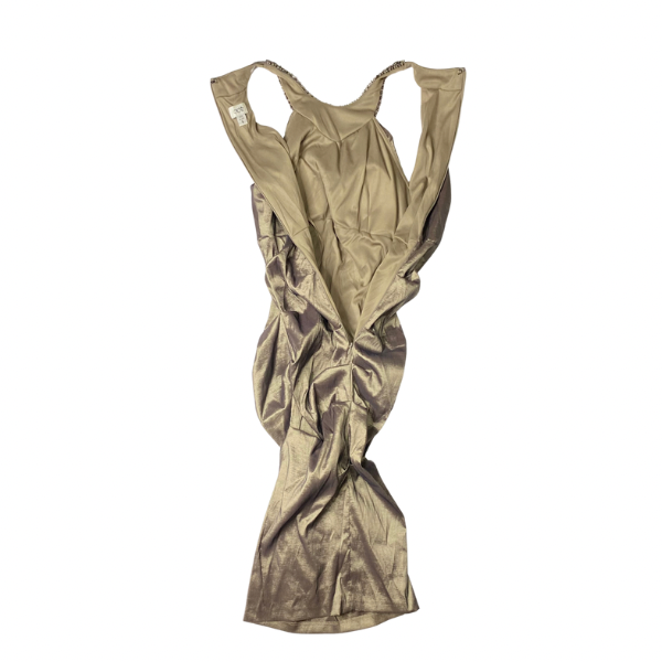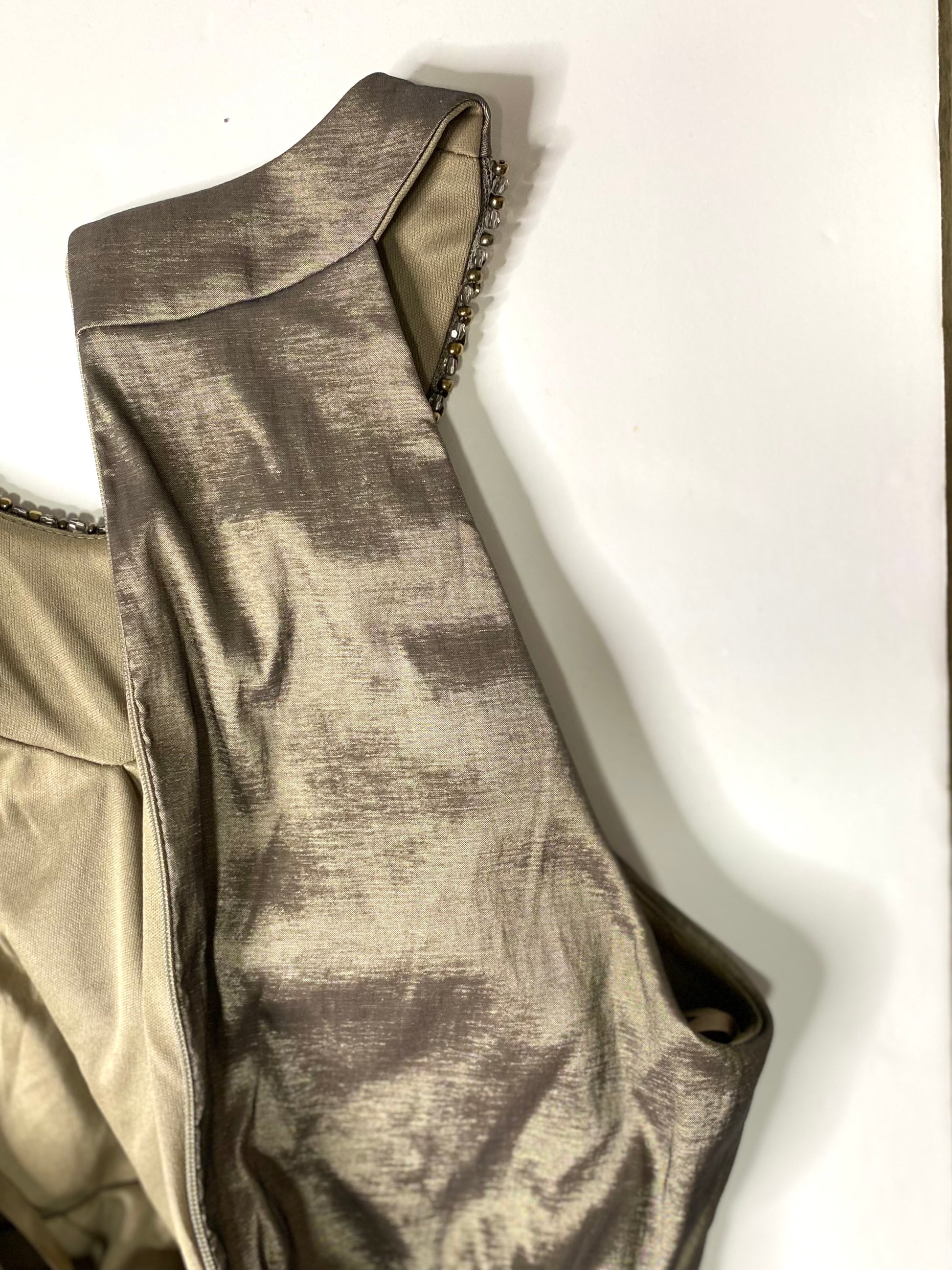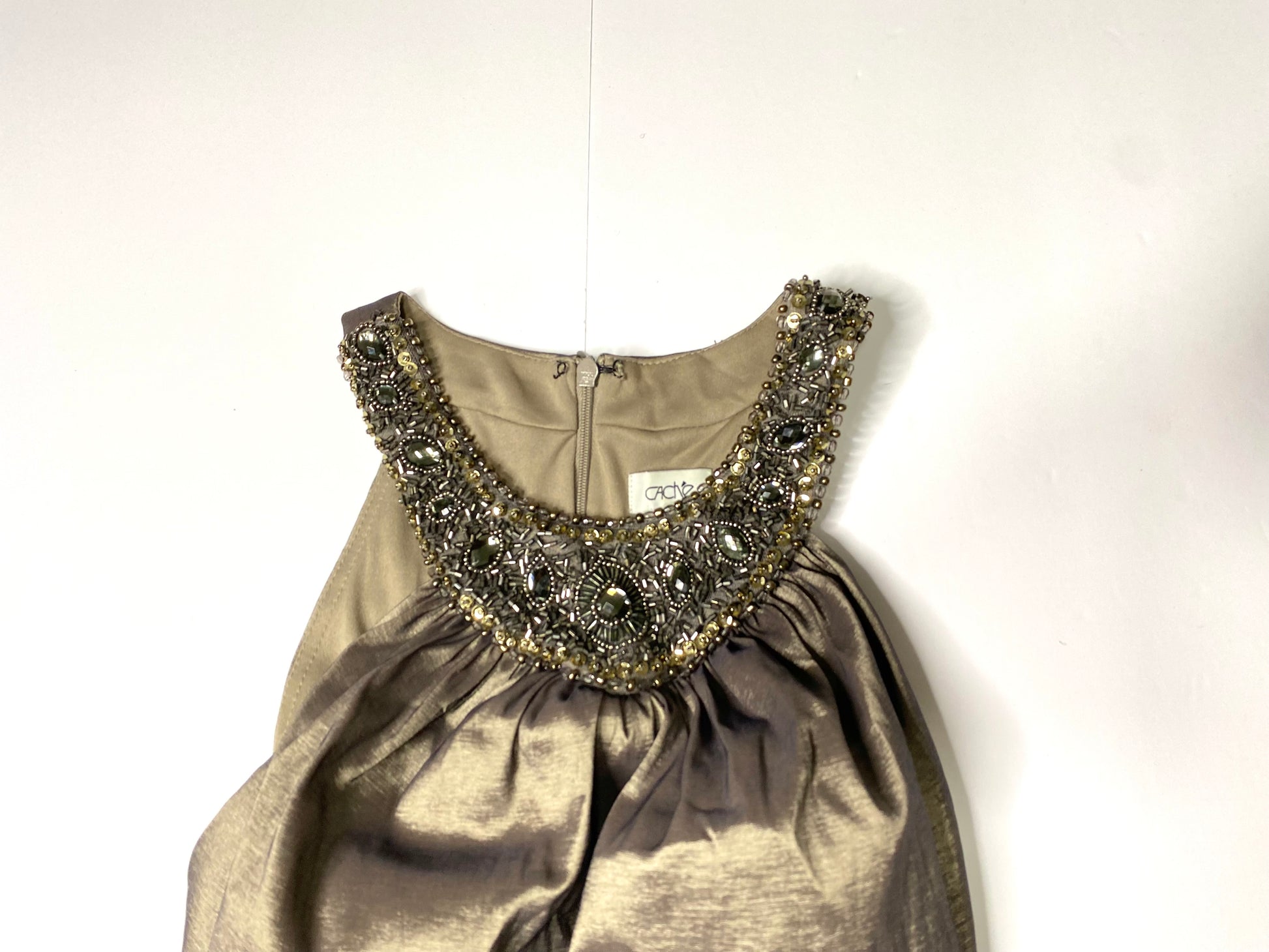Cache Metallic & Bronze Ruched Formal Dress – Sleeveless with Beaded Embellished Collar