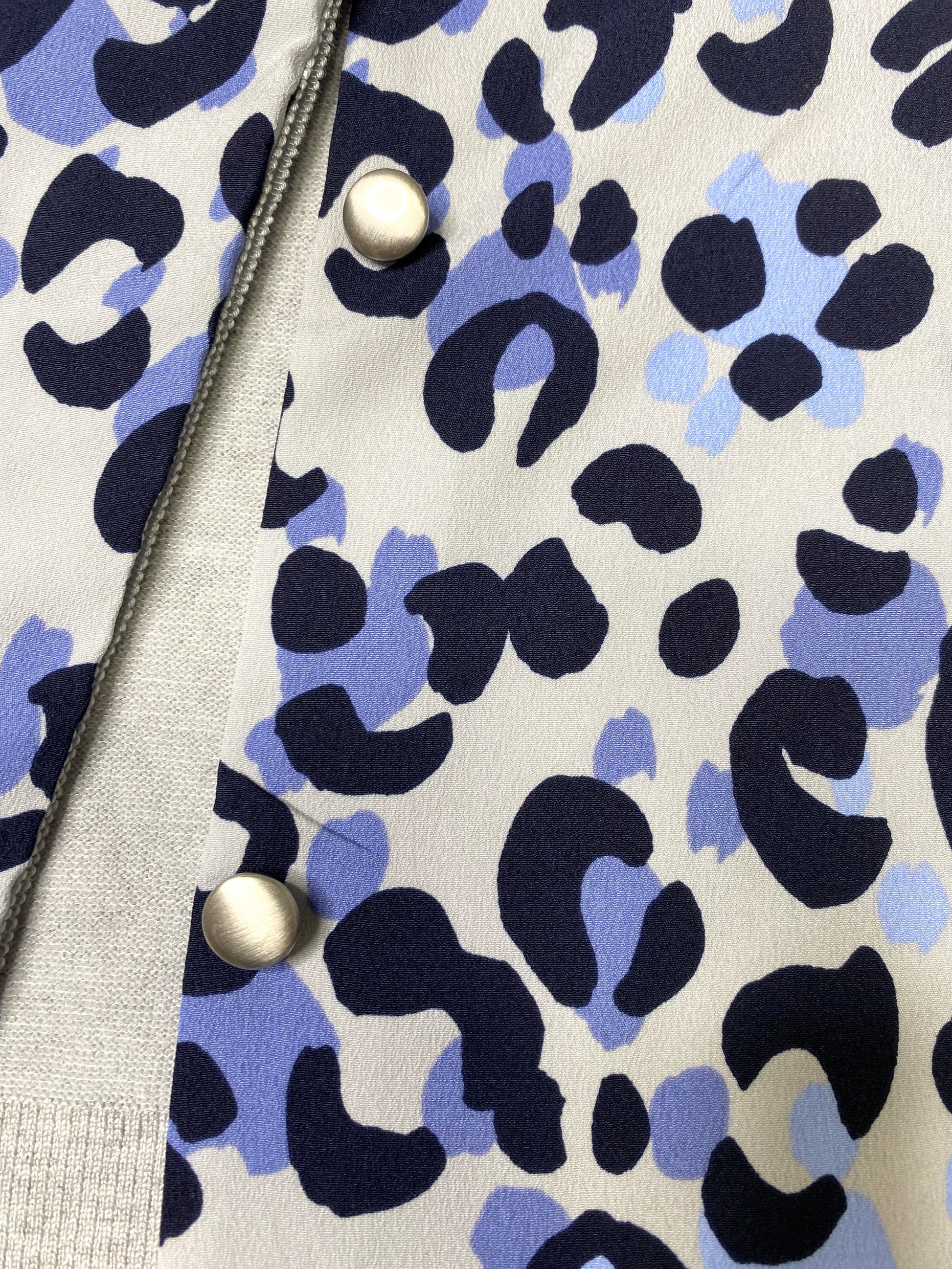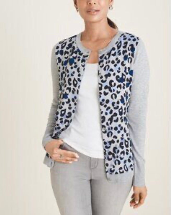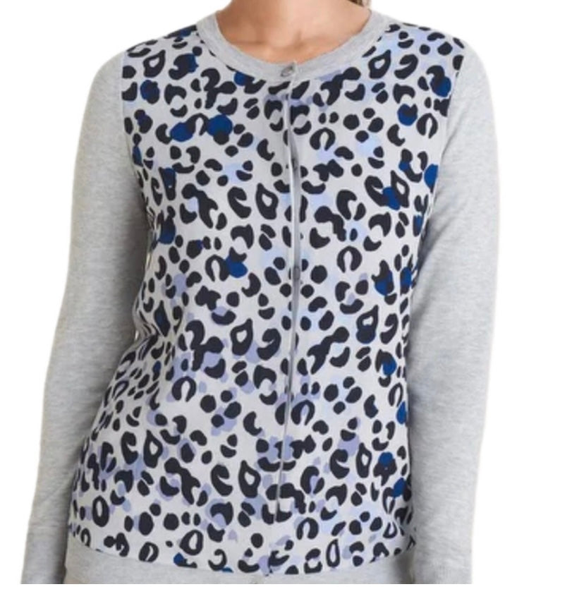Add a bold statement to your wardrobe with this Chico’s cardigan sweater featuring a unique grey and blue camo (army fatigue) pattern. Designed in a lightweight knit with long sleeves and a classic crew neck, it’s perfect for layering in any season.