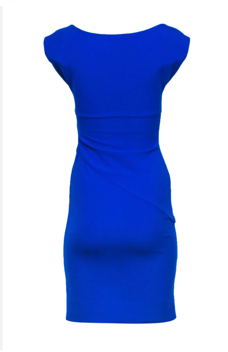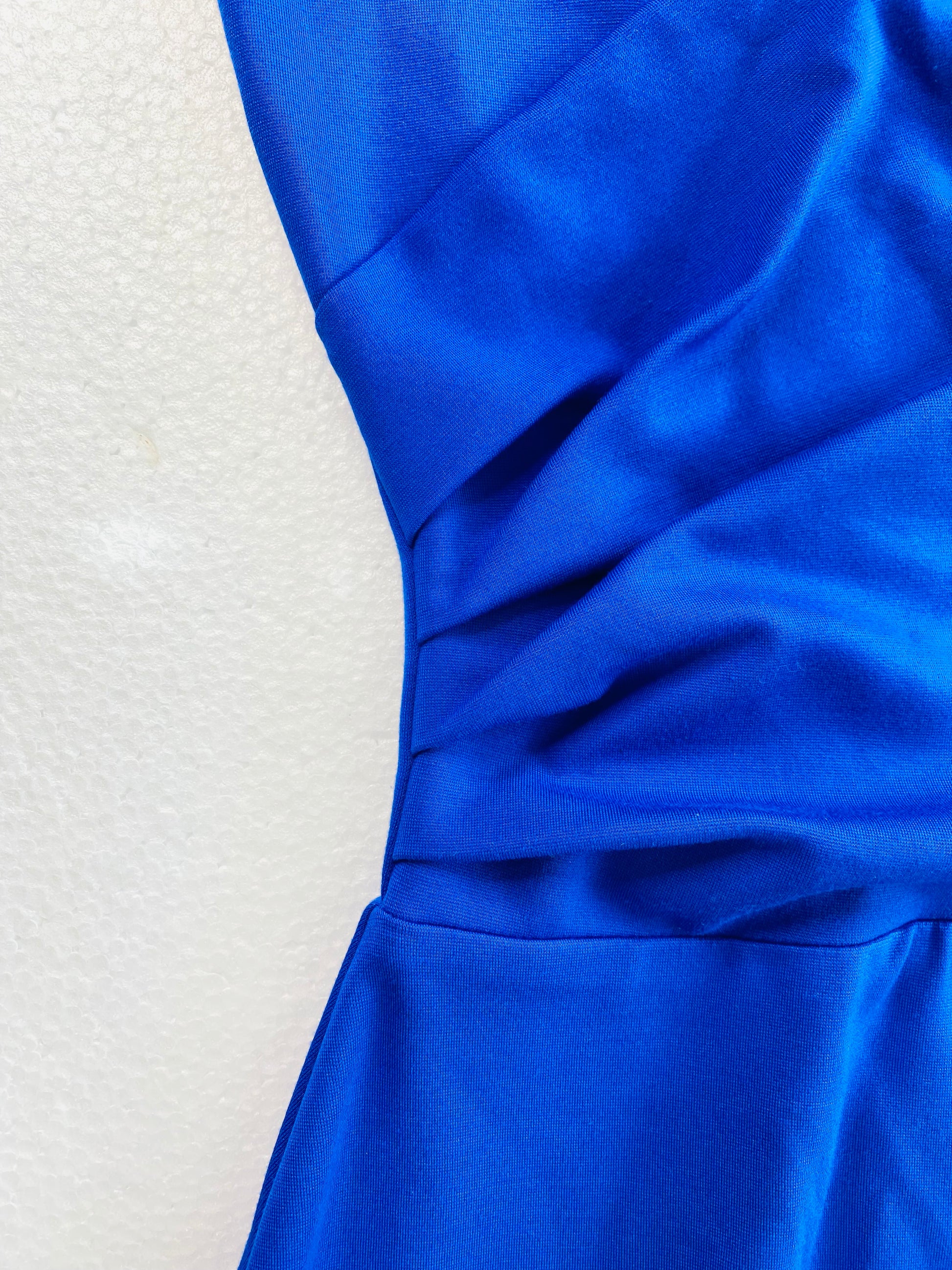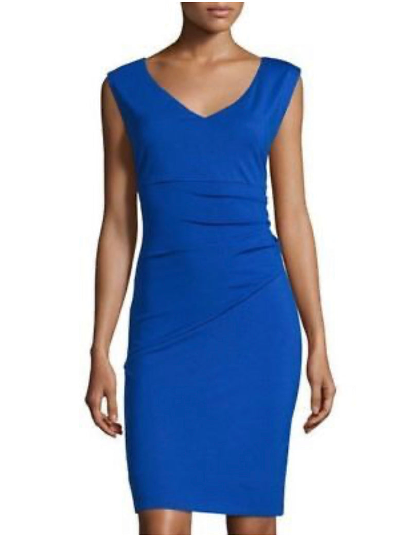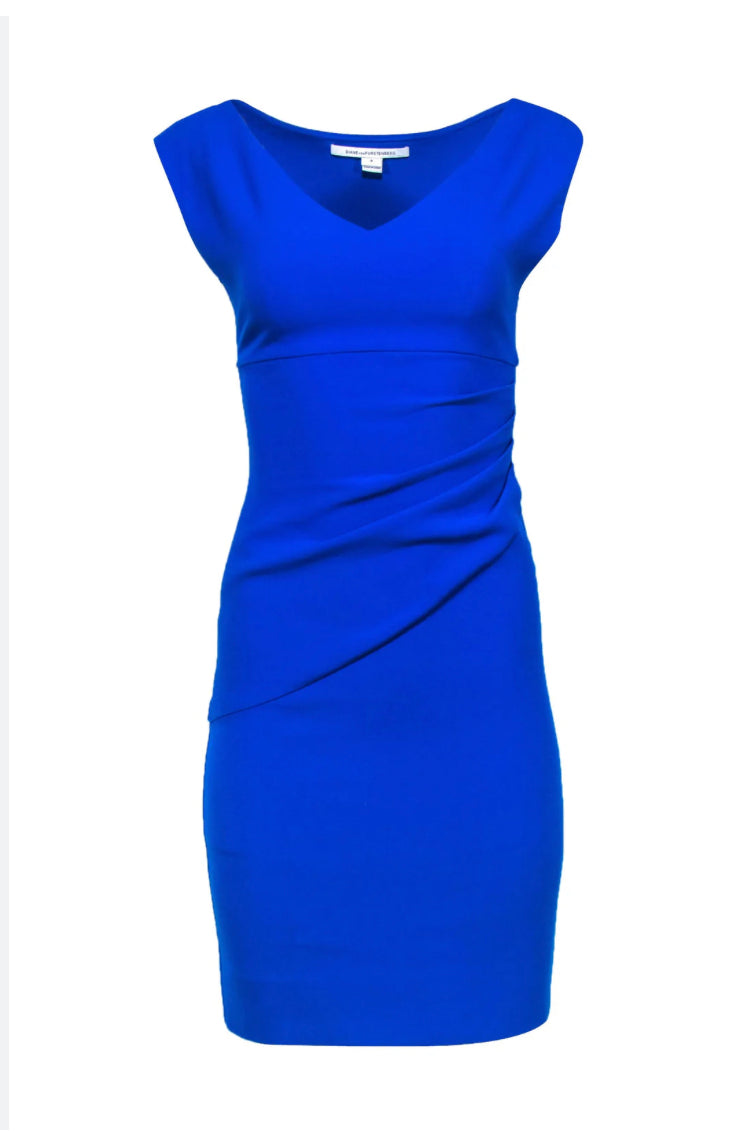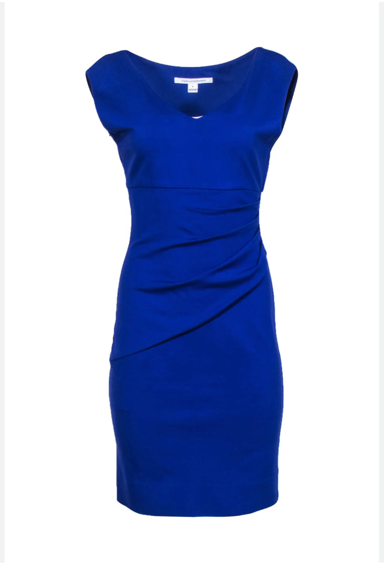DVF Cobalt Blue Sheath Dress Size Small | V-Neck Ruched Waist | Side Zipper Closure