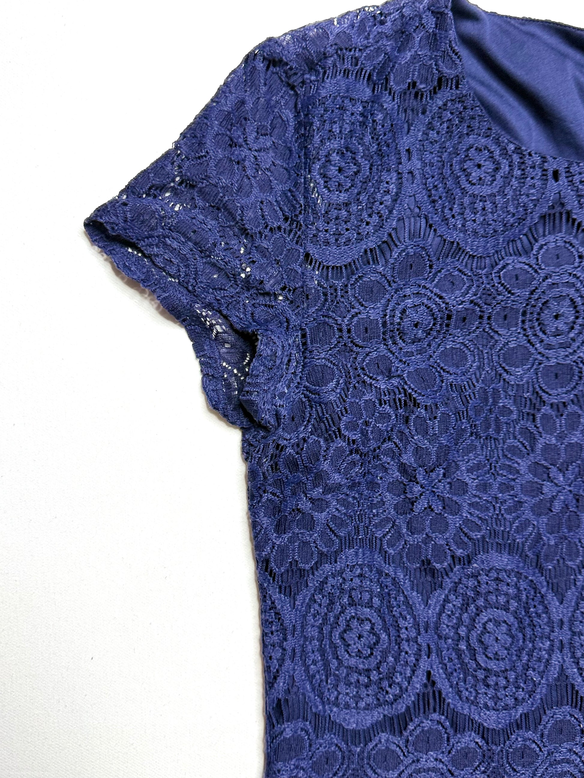 Elegant and feminine, this Laundry by Shelli Segal navy blue lace dress is perfect for cocktail parties, weddings, or formal events. Designed in a flattering size 4, it features delicate cap sleeves, a round neckline, a hidden back zipper, and full lining for comfort. The all-over lace detailing adds timeless sophistication, while the tailored fit creates a graceful silhouette.
