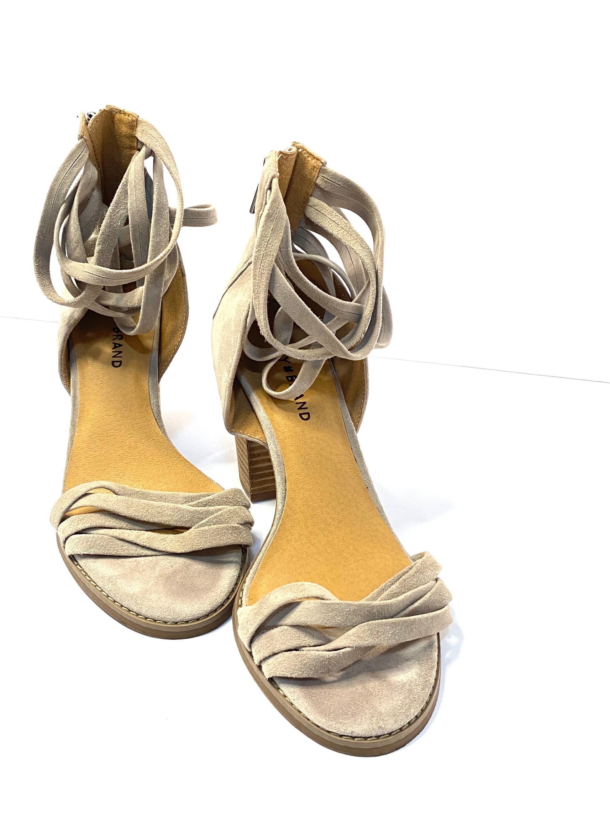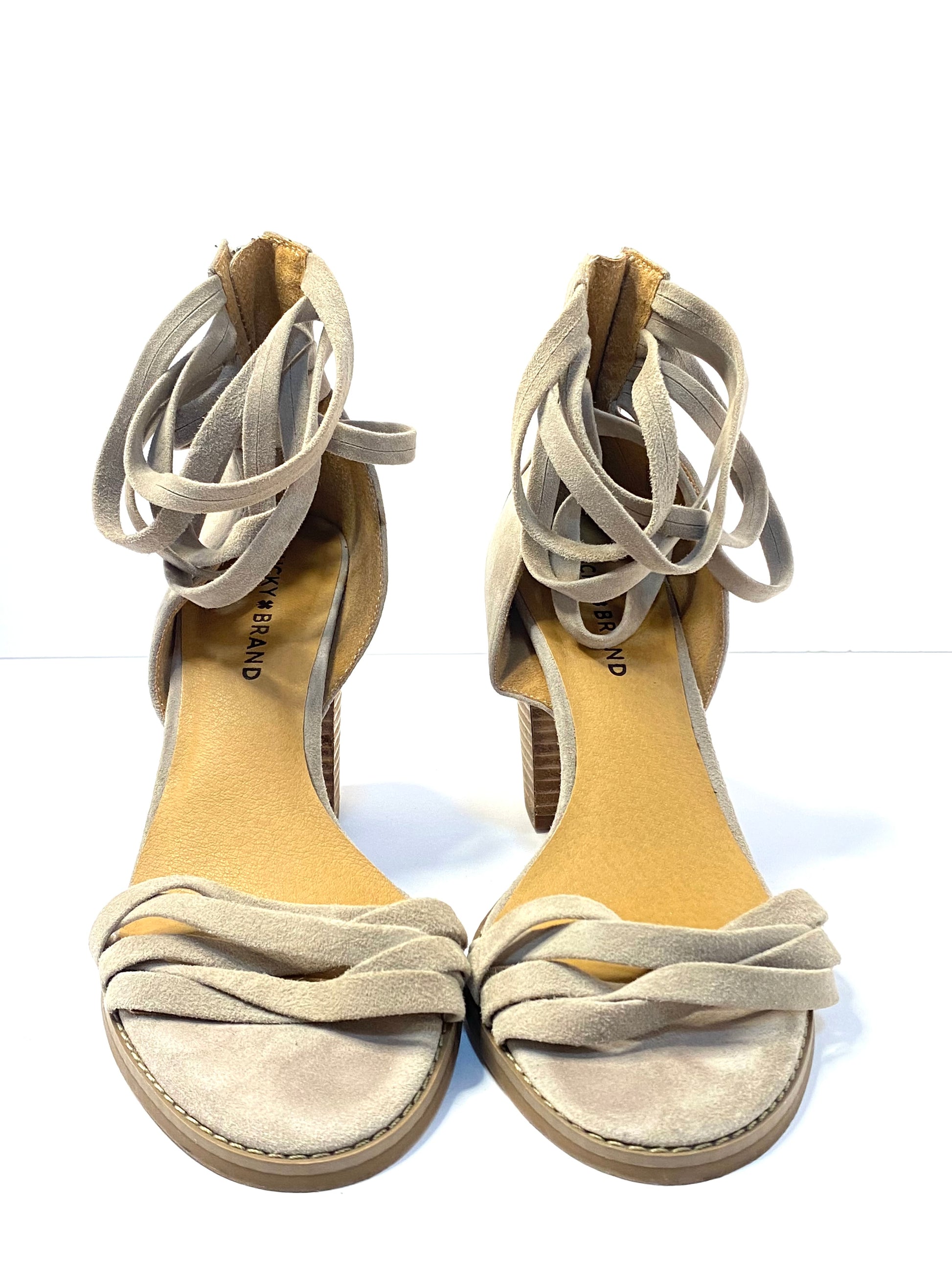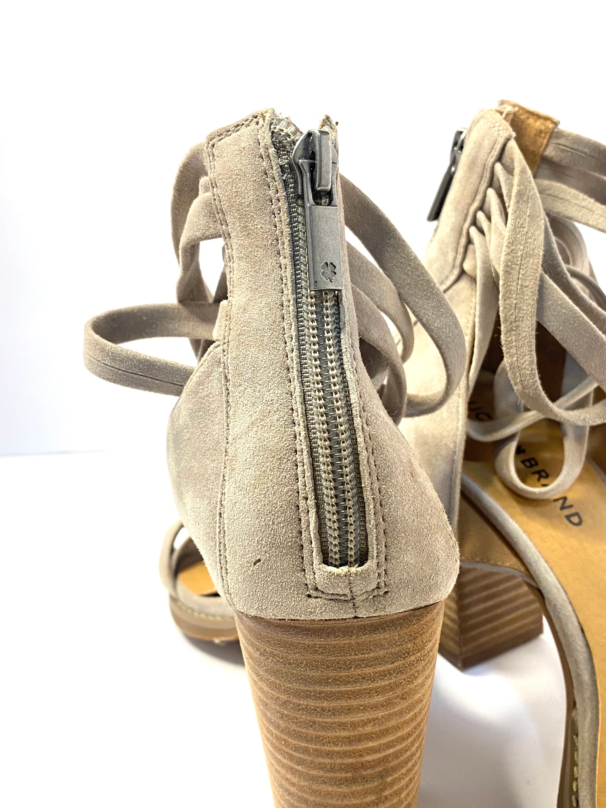 Lucky Brand Tan Suede Open-Toe Sandals – Size 9 – Chunky Heel – Zipper Closure – 3" Heel