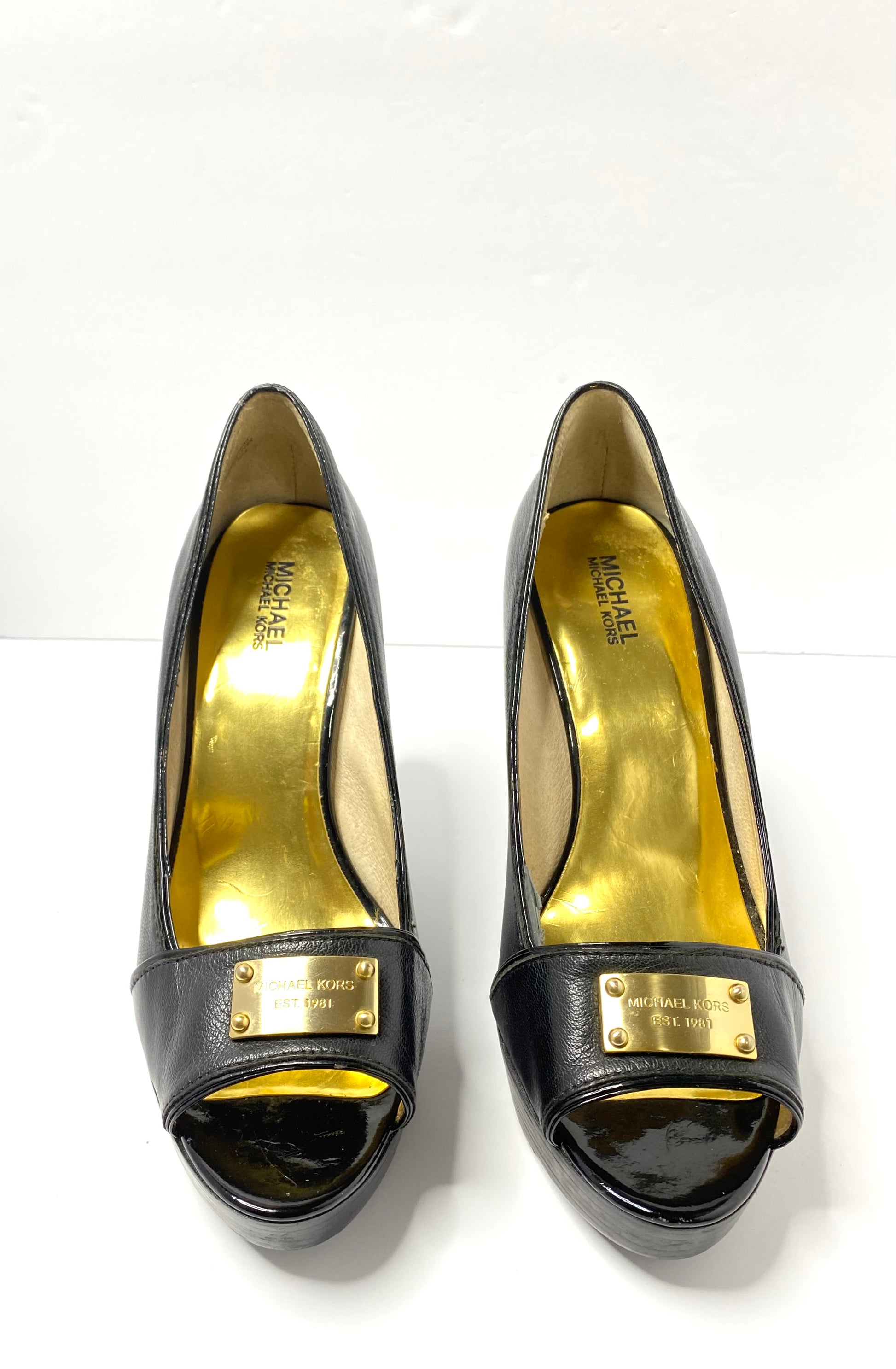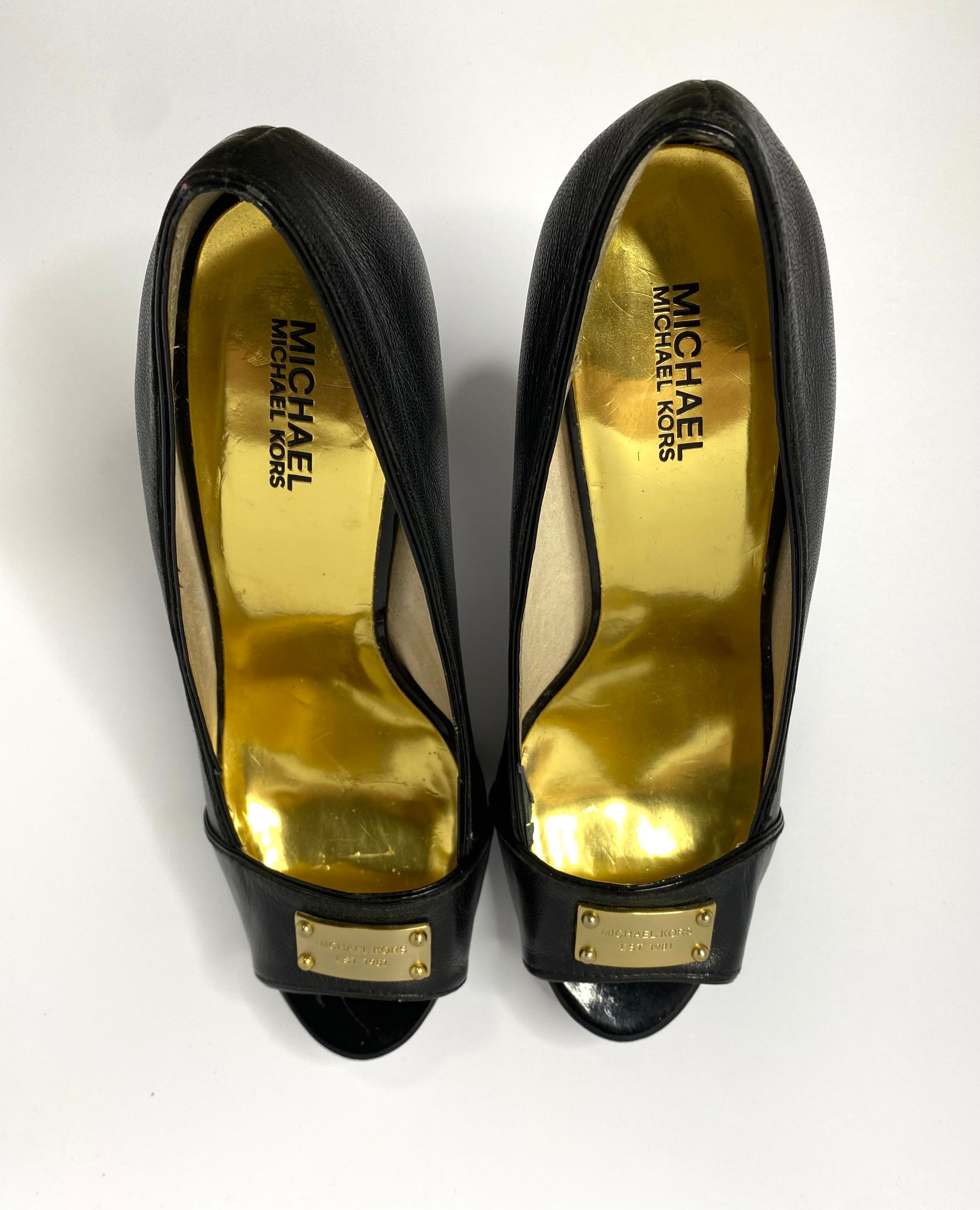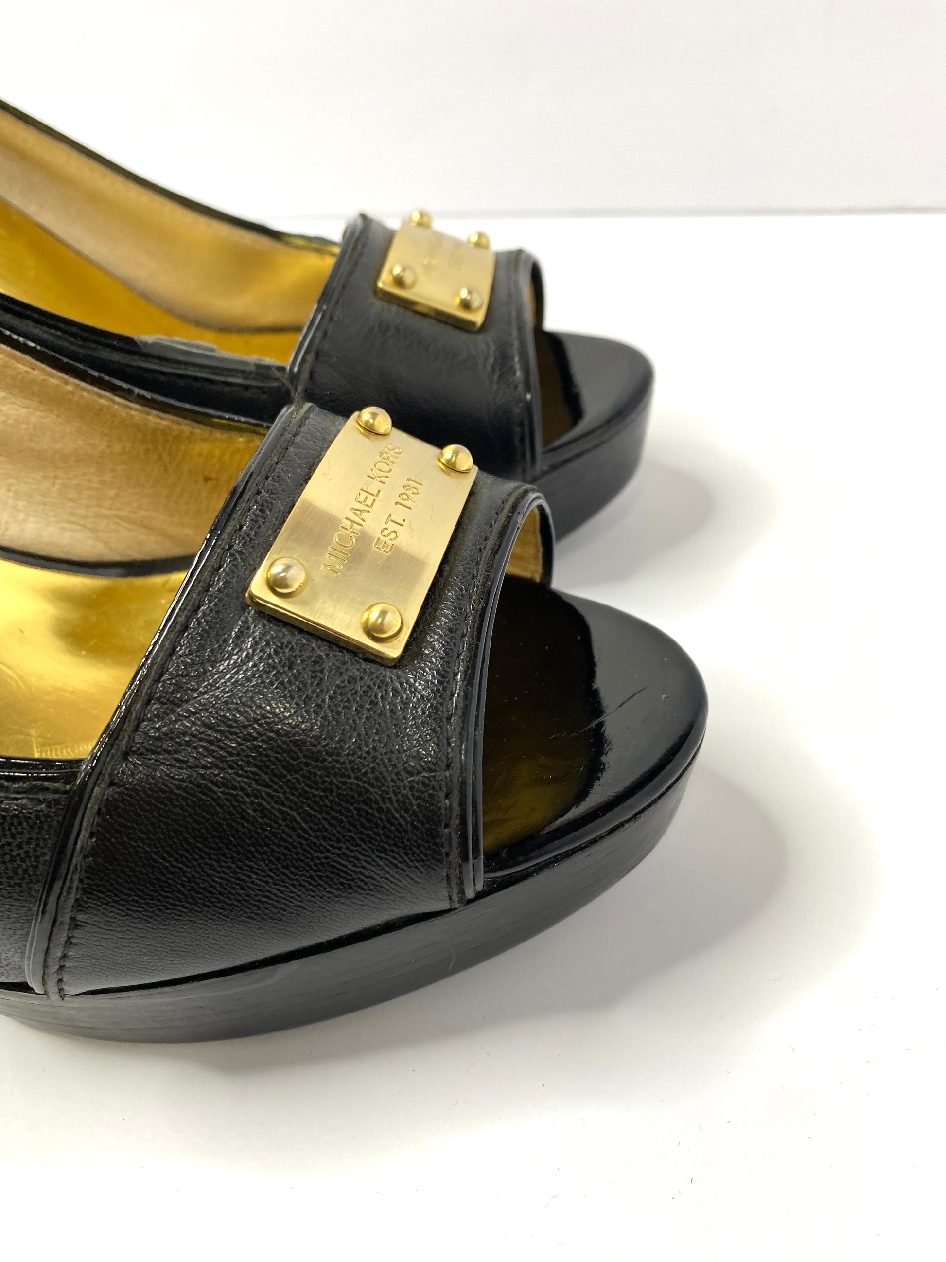 Michael Kors Black Leather Open-Toe Pumps – Size 11 – Gold Logo Plate – 3.75” Heel – Classic Style