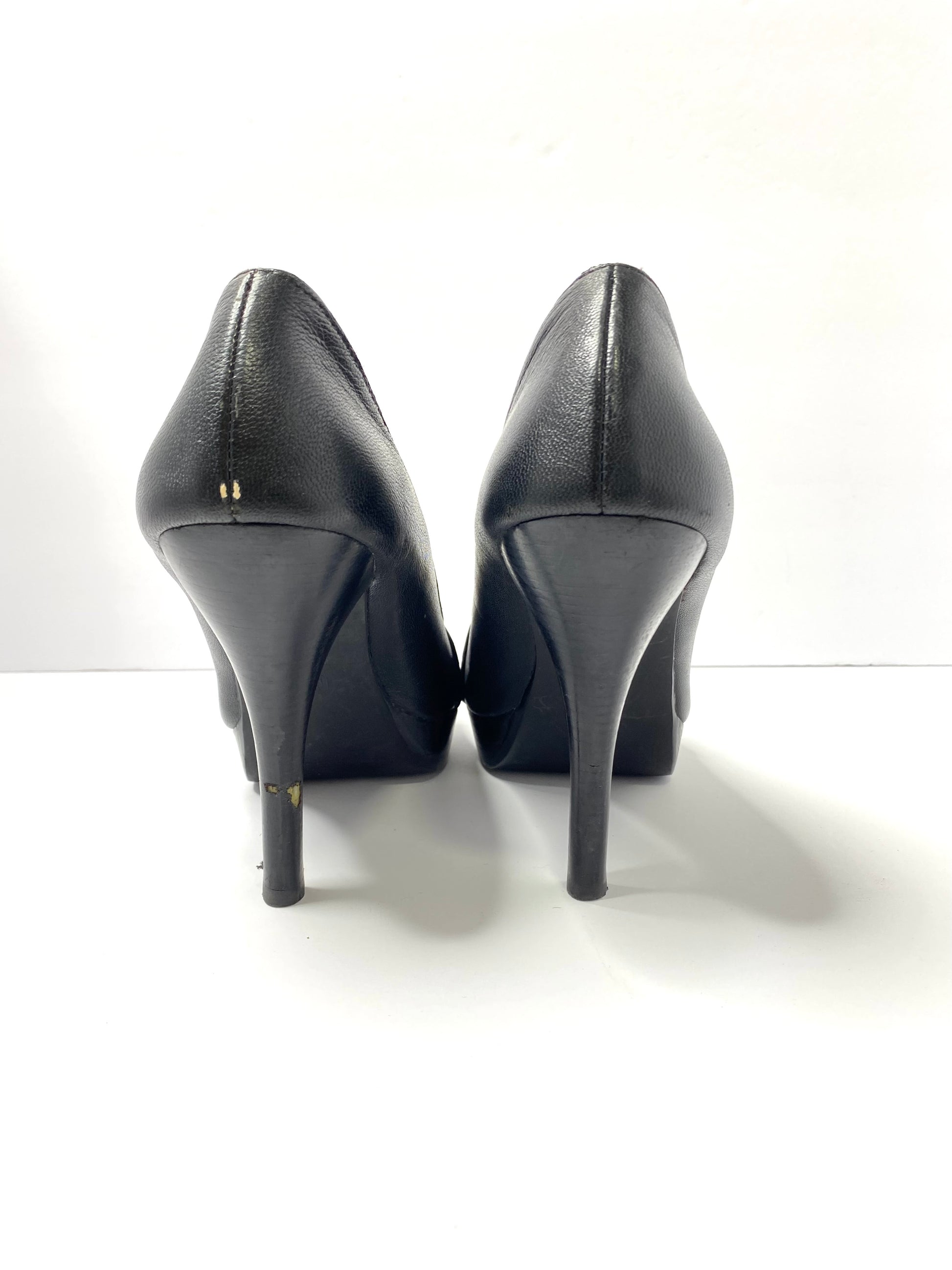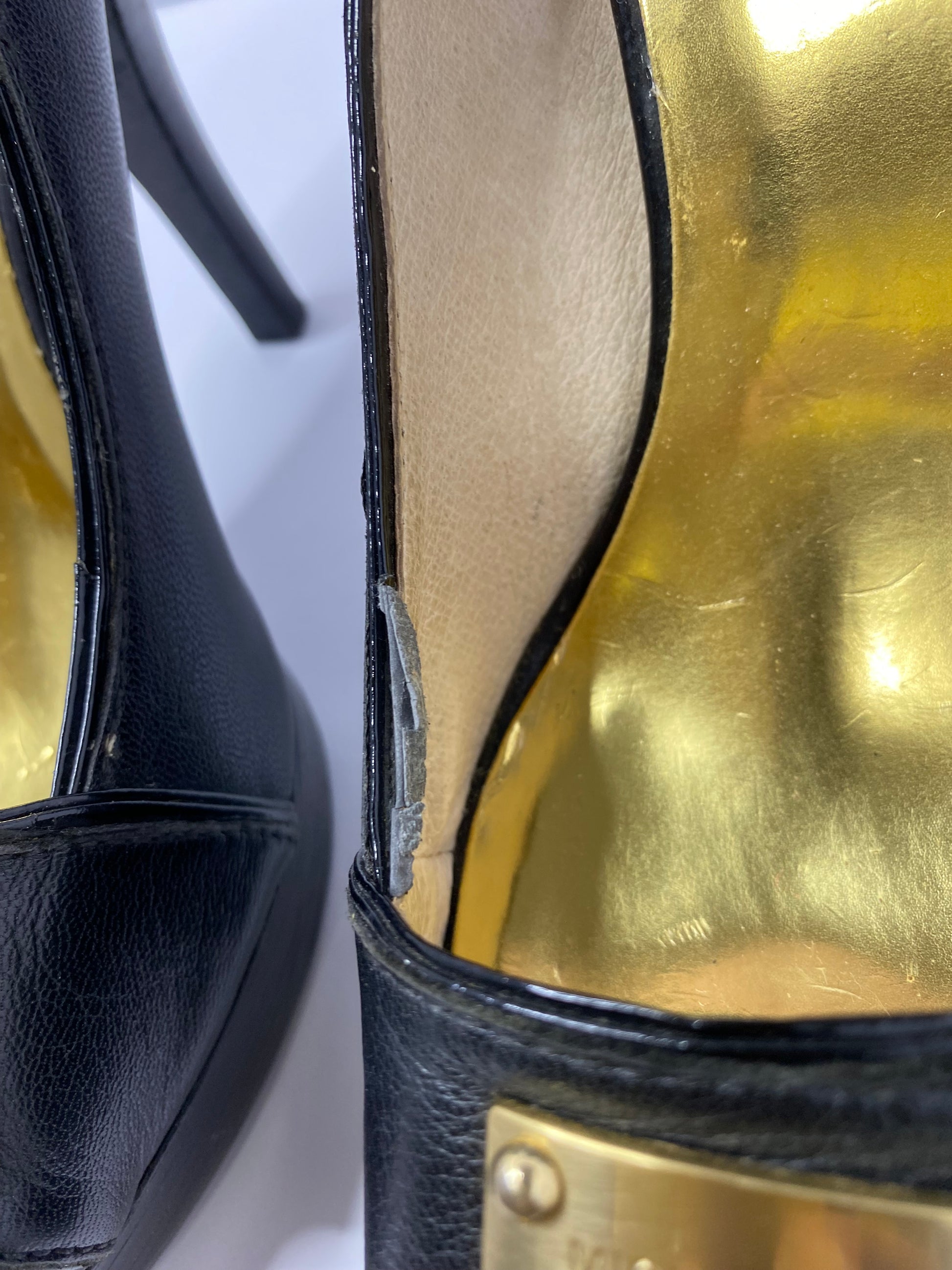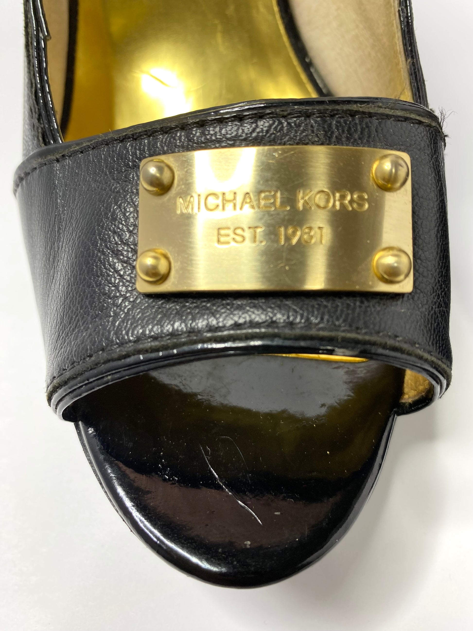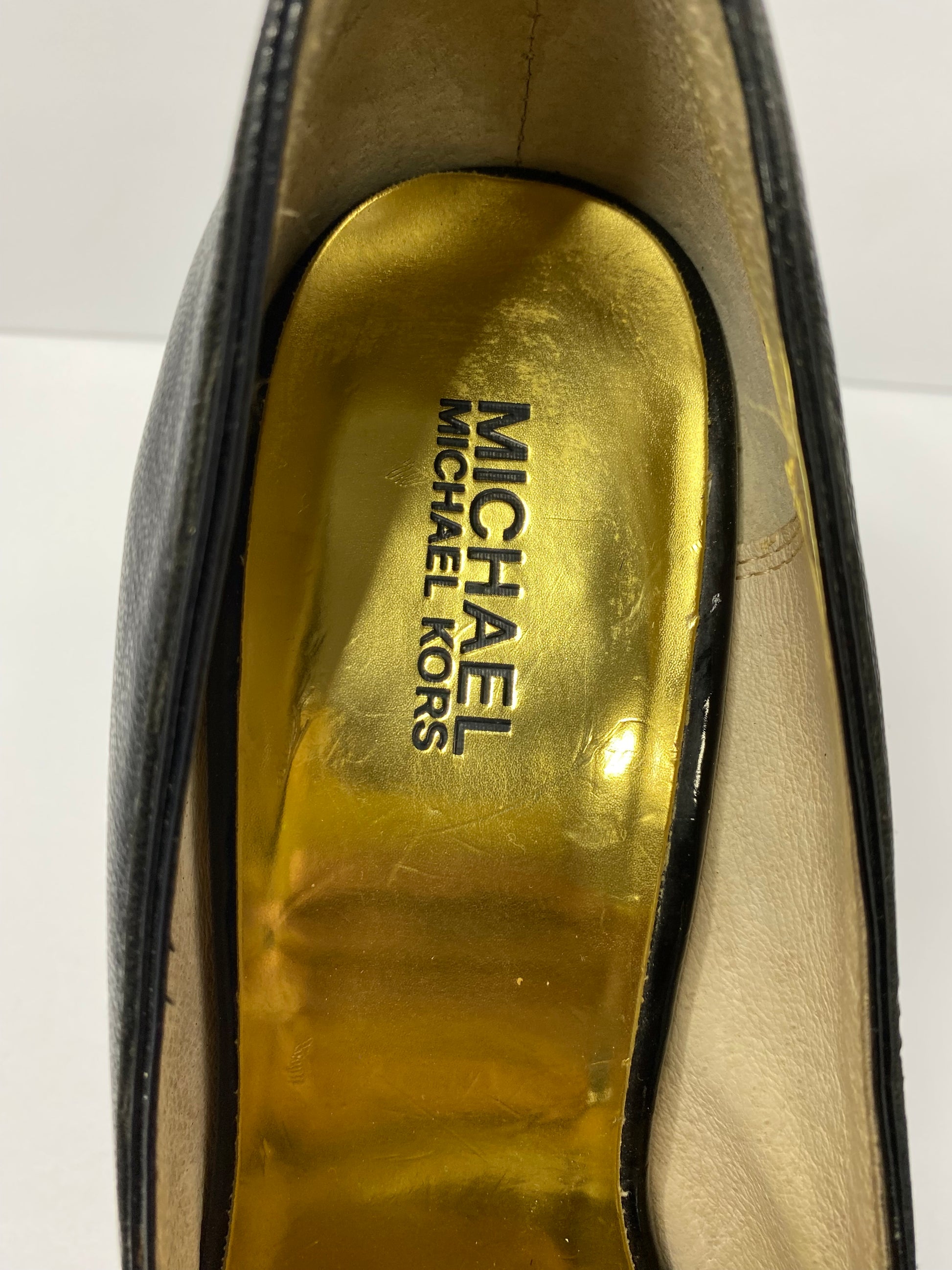 Michael Kors Black Leather Open-Toe Pumps – Size 11 – Gold Logo Plate – 3.75” Heel – Classic Style