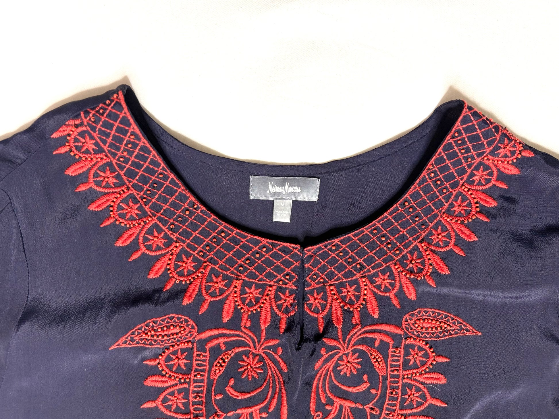 This Neiman Marcus shift dress blends timeless elegance with vibrant detailing. Crafted from 100% viscose, it features a classic navy blue base with intricate red embroidery around the neckline and short sleeves, giving it a decorative, ethnic-inspired flair. The shift silhouette offers a relaxed yet flattering fit, making it versatile for both casual and dressier occasions.
