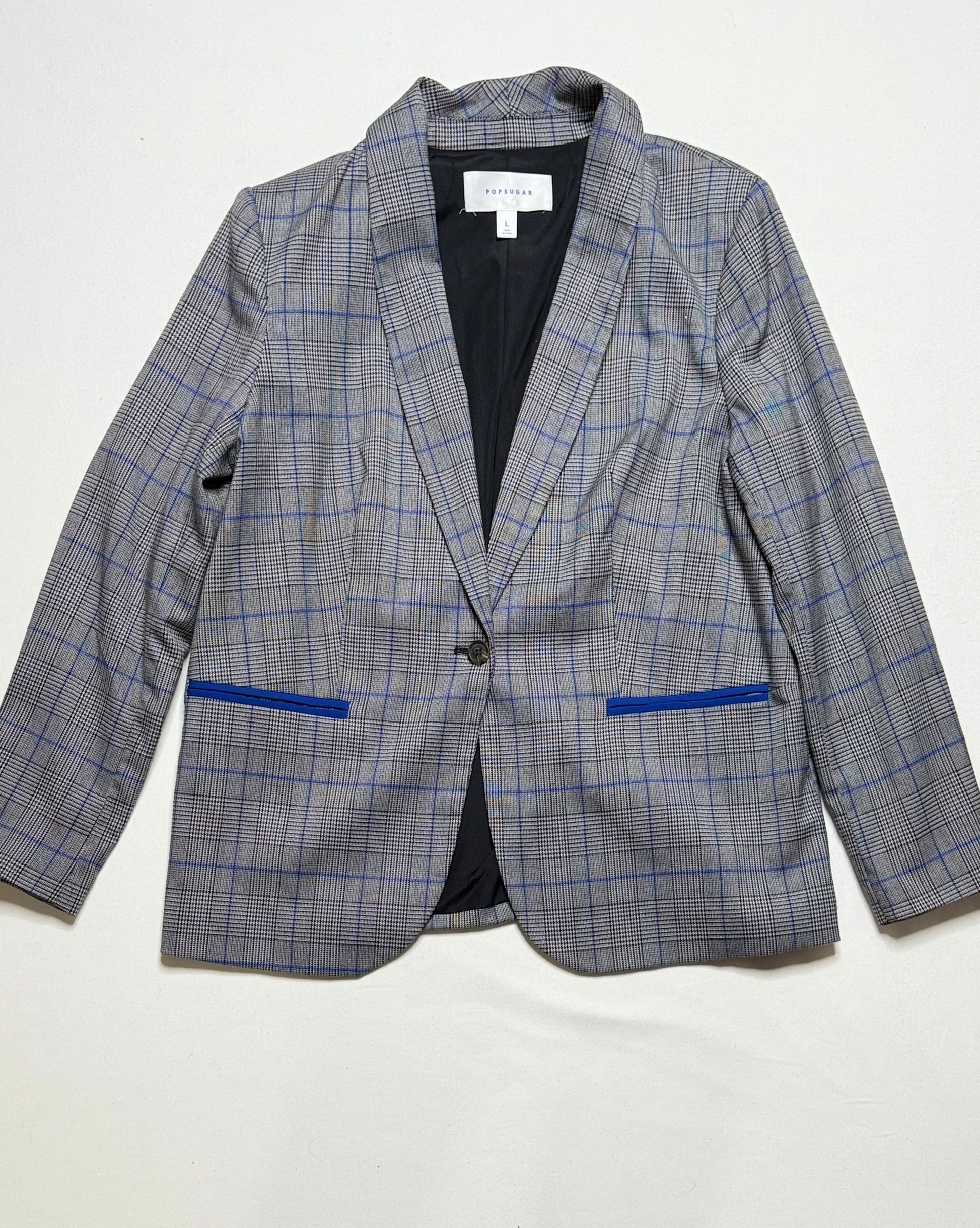 Add bold structure to your wardrobe with this Pop Sugar longline blazer featuring a black, white, and blue checker print. Tailored with a single button closure, front pockets, and a sleek lined interior, this size large blazer offers a modern twist on a timeless silhouette.