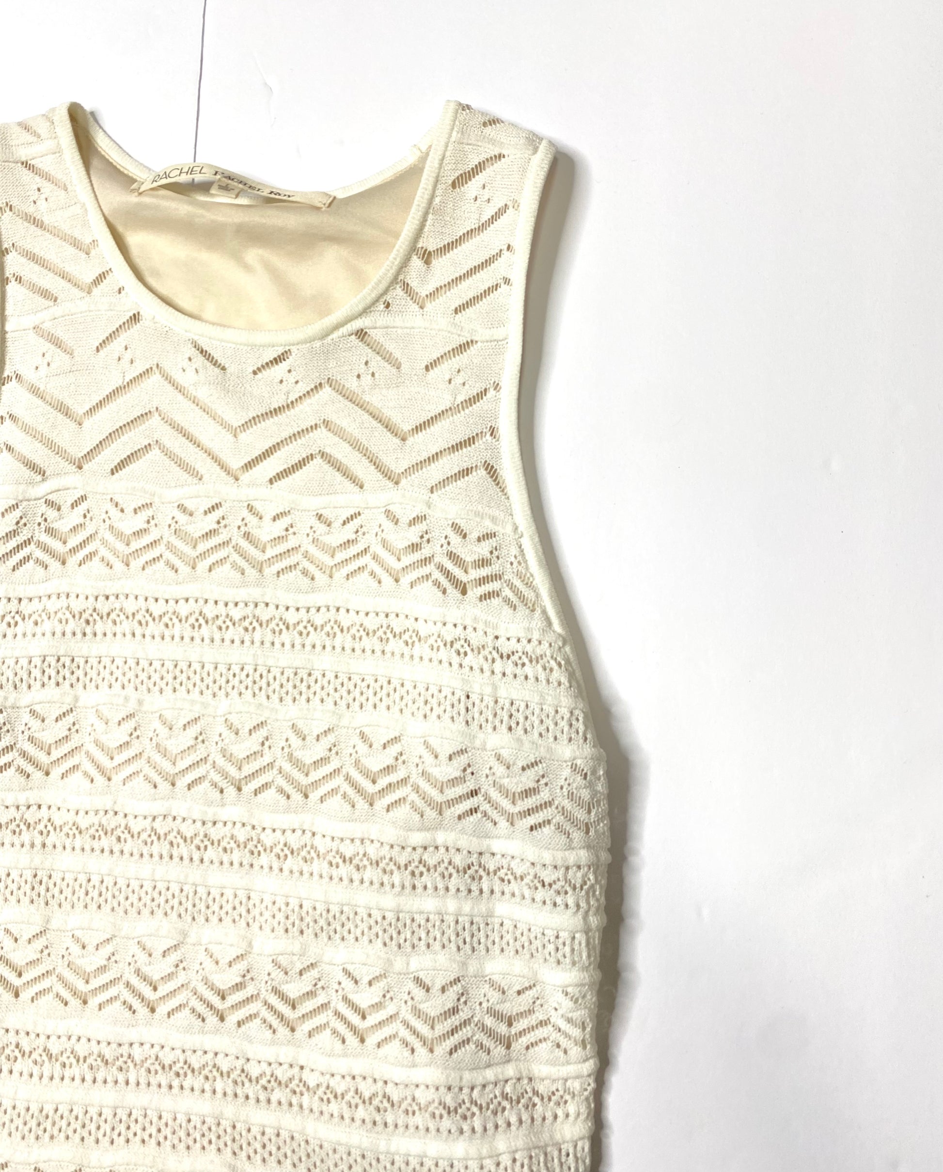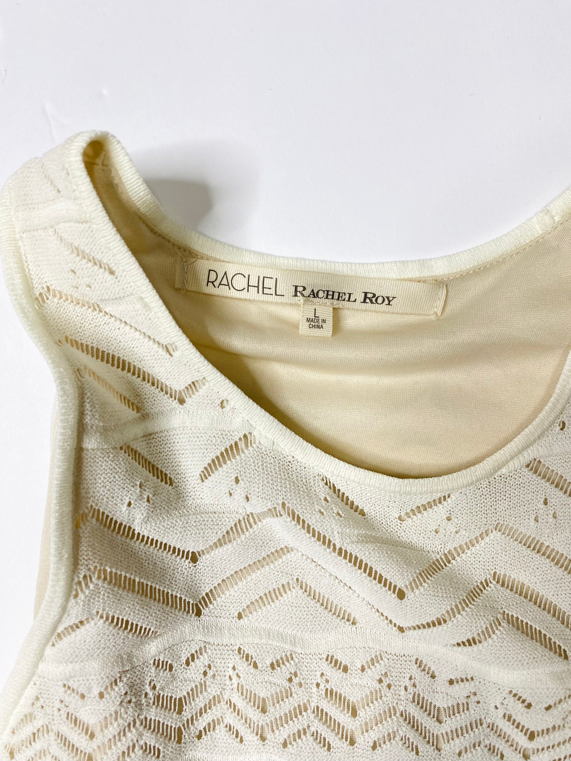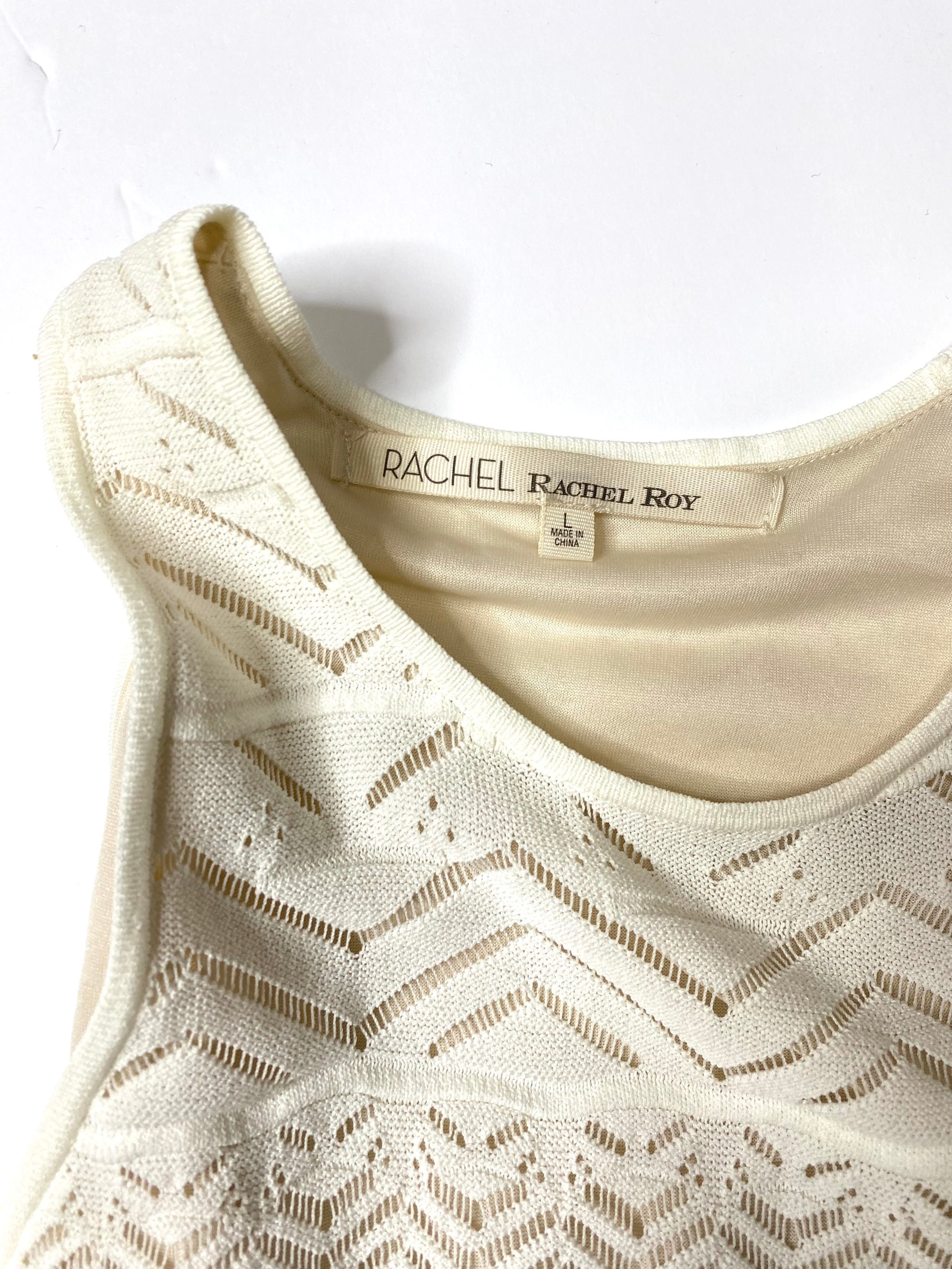 This elegant cream tank top by RACHEL Rachel Roy features a feminine ruffle hem and a high crew neckline. The subtle geometric pattern adds a touch of sophistication, while the knit texture ensures comfort and style. Perfect for any occasion, this top offers a flattering A-line silhouette.
