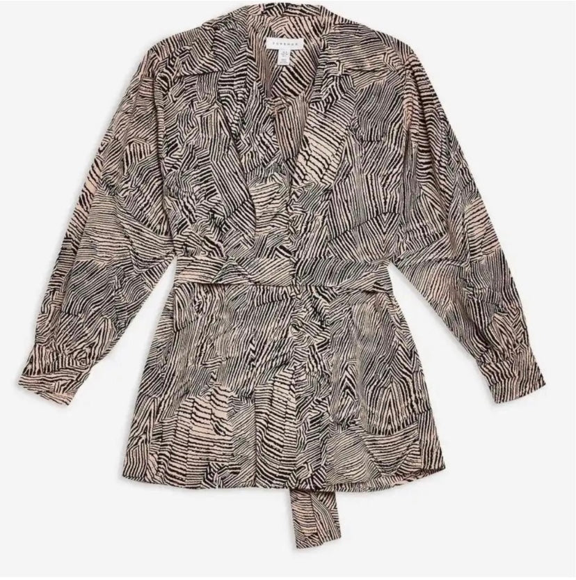 Chic and versatile Topshop long sleeve blouse in a bold animal print. Features a stylish button-down front, bow tie neckline, and a belted waist for a flattering silhouette.