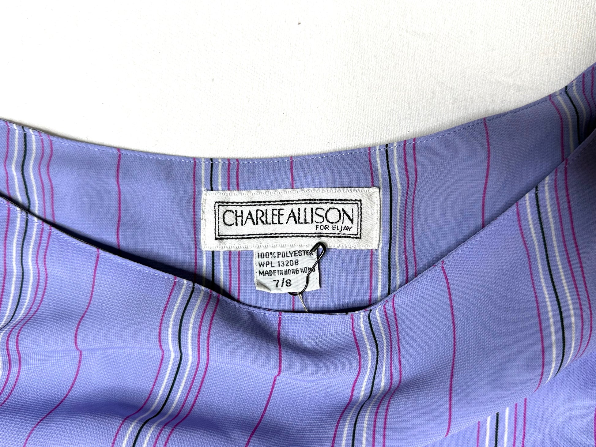Step back into classic vintage charm with this stunning Charlee Allison for Eljay lavender striped midi dress, a timeless piece that blends retro sophistication with feminine details. Crafted from soft, lightweight 100% polyester, this dress is ideal for adding a polished yet playful touch to your wardrobe.